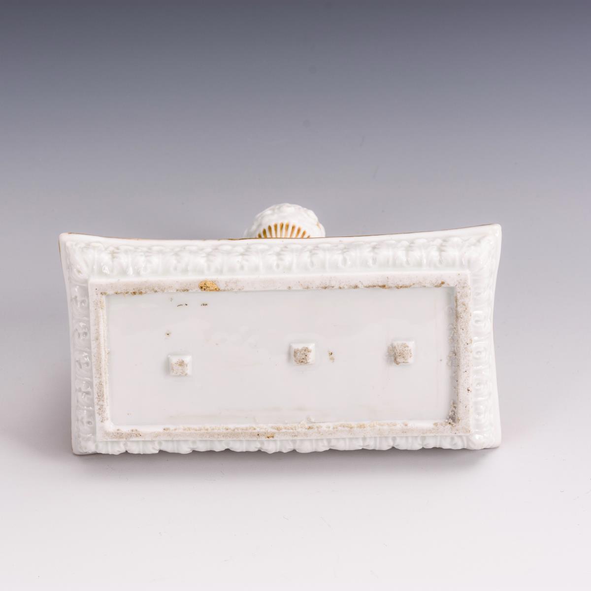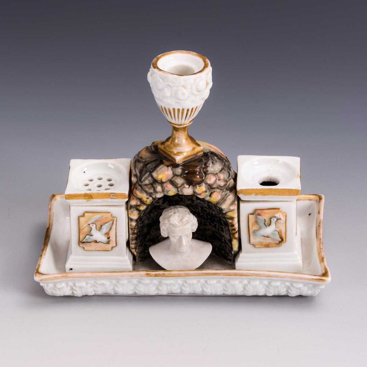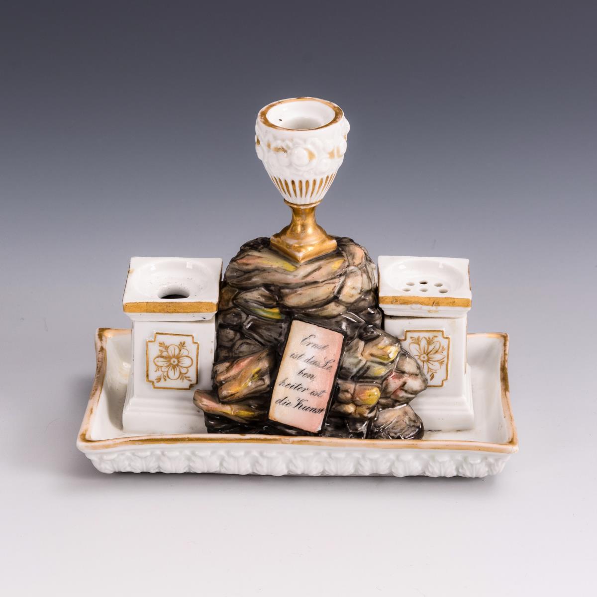 Rechteckige Schale, darin eine Felsgrotte mit einer Vase als Federhalter, in der Grotte eine Schillerbüste stehend, verso der Grotte eine Tafel mit der Aufschrift "Ernst ist das Leben, heiter ist die Kunst". Die Grotte flankierend zwei Postamente als Tintenfass- bzw. Streudose. Partieller Goldabrieb.