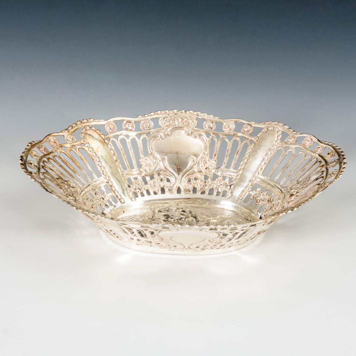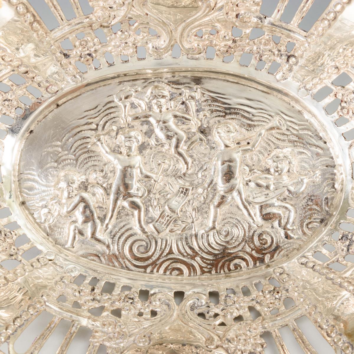 Ovales, teils durchbrochen gearbeitetes Reliefschälchen mit musizierenden Putten im Spiegel.