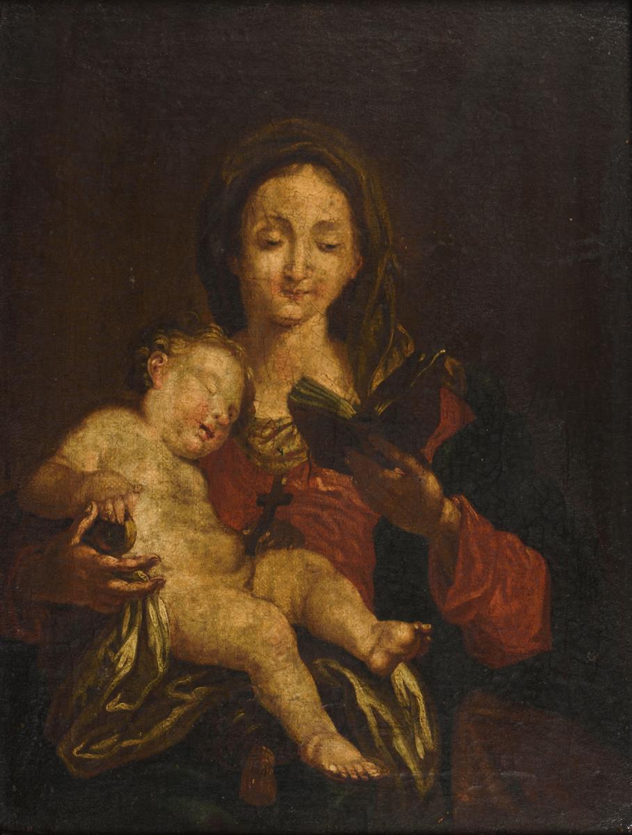 Die Muttergottes beim Lesen mit dem schlafenden Jesusknaben auf dem Arm. Leinwand doubliert.