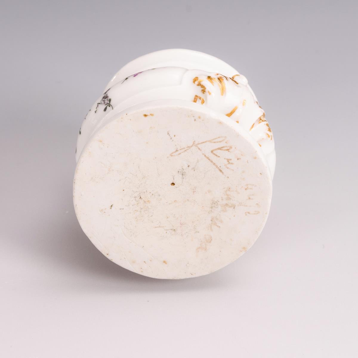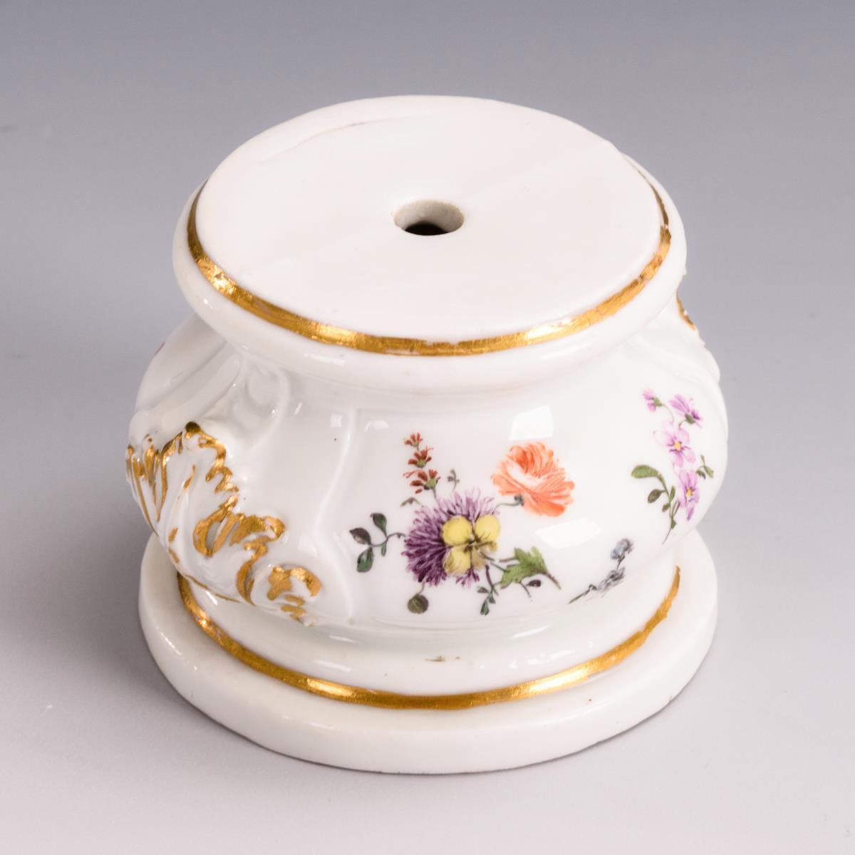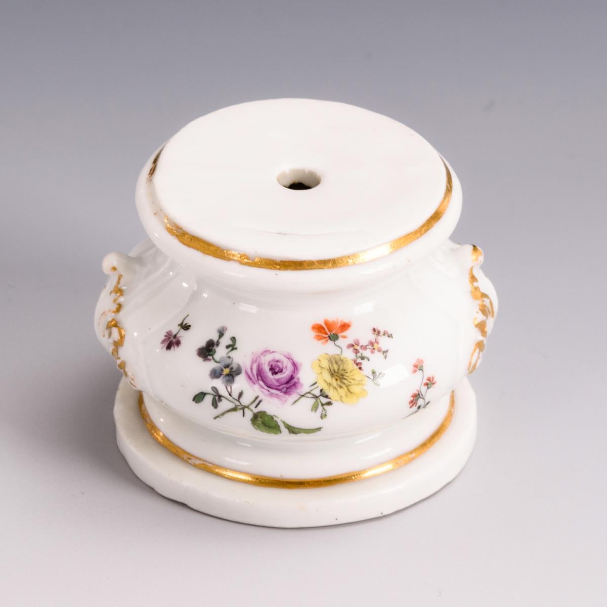 Gedrückter Balustersockel mit Blumenmalerei. Gold etwas berieben, minimale Bestoßung am Stand.