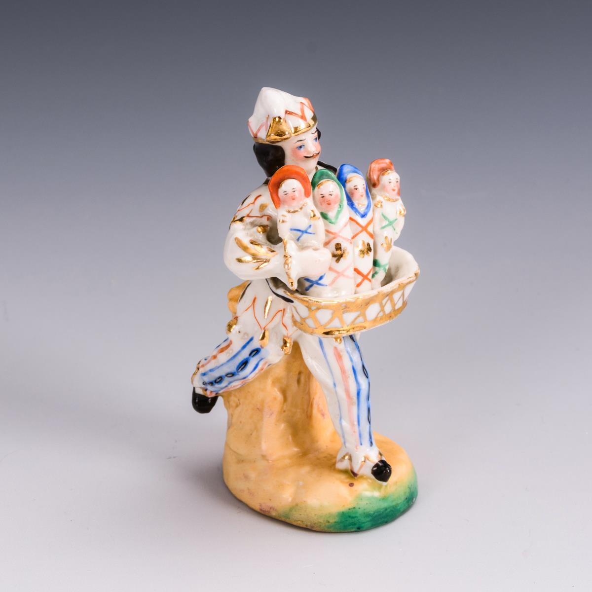 Laufender Harlekin mit vier Fatschenkindern in einem Korb.
