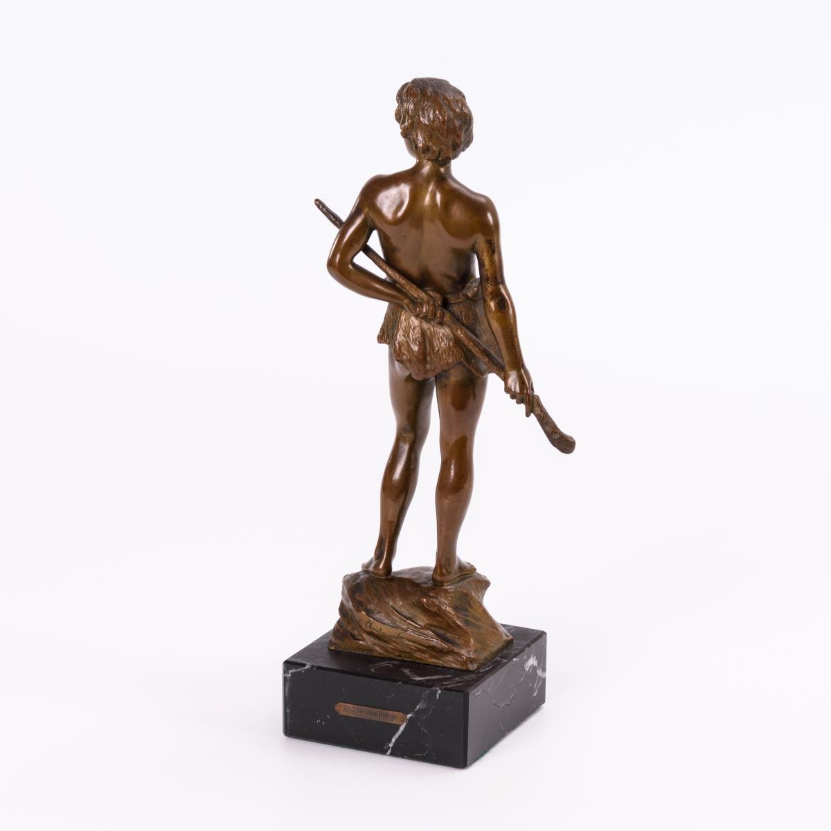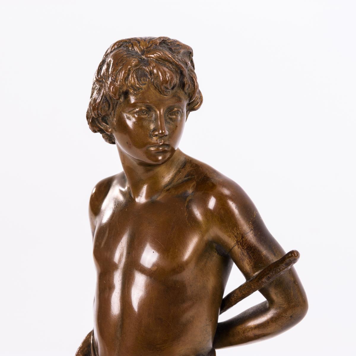 Lediglich mit einem Lendenschurz bekleideter Hirtenknabe. Sichtbare Armnähte, teils Patinaverfärbungen.