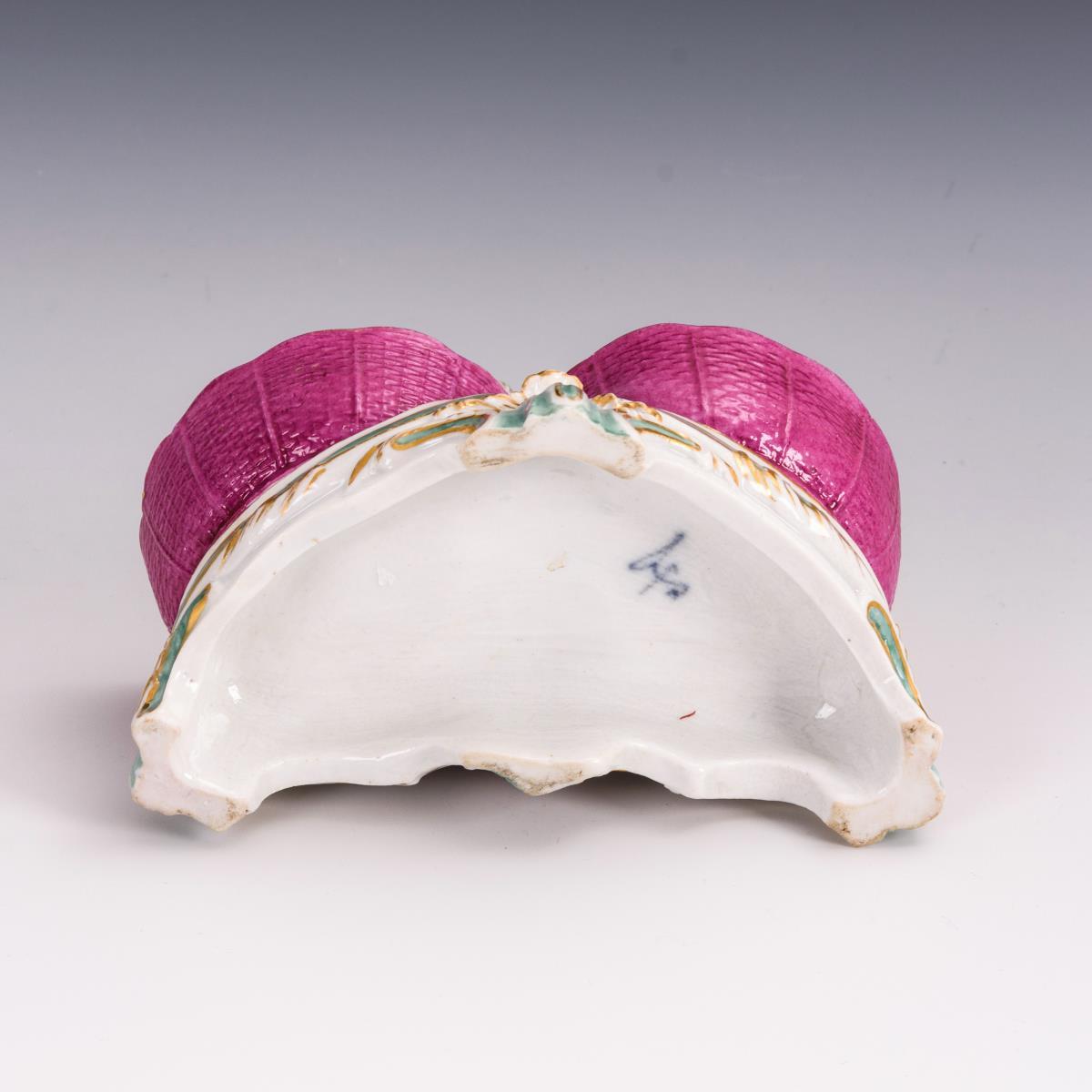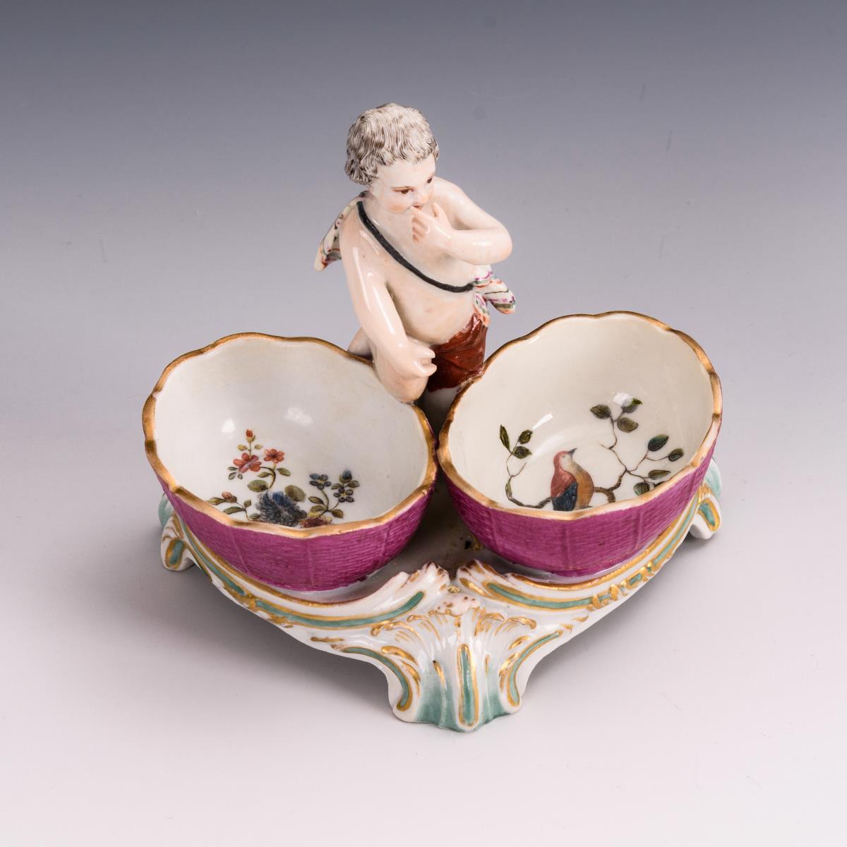 Zwischen zwei Salzschalen stehender, sich den Finger leckender Putto, auf Rocaillesockel. 1 Schalenrand, rechter Arm und Teil des Tuches restauriert.