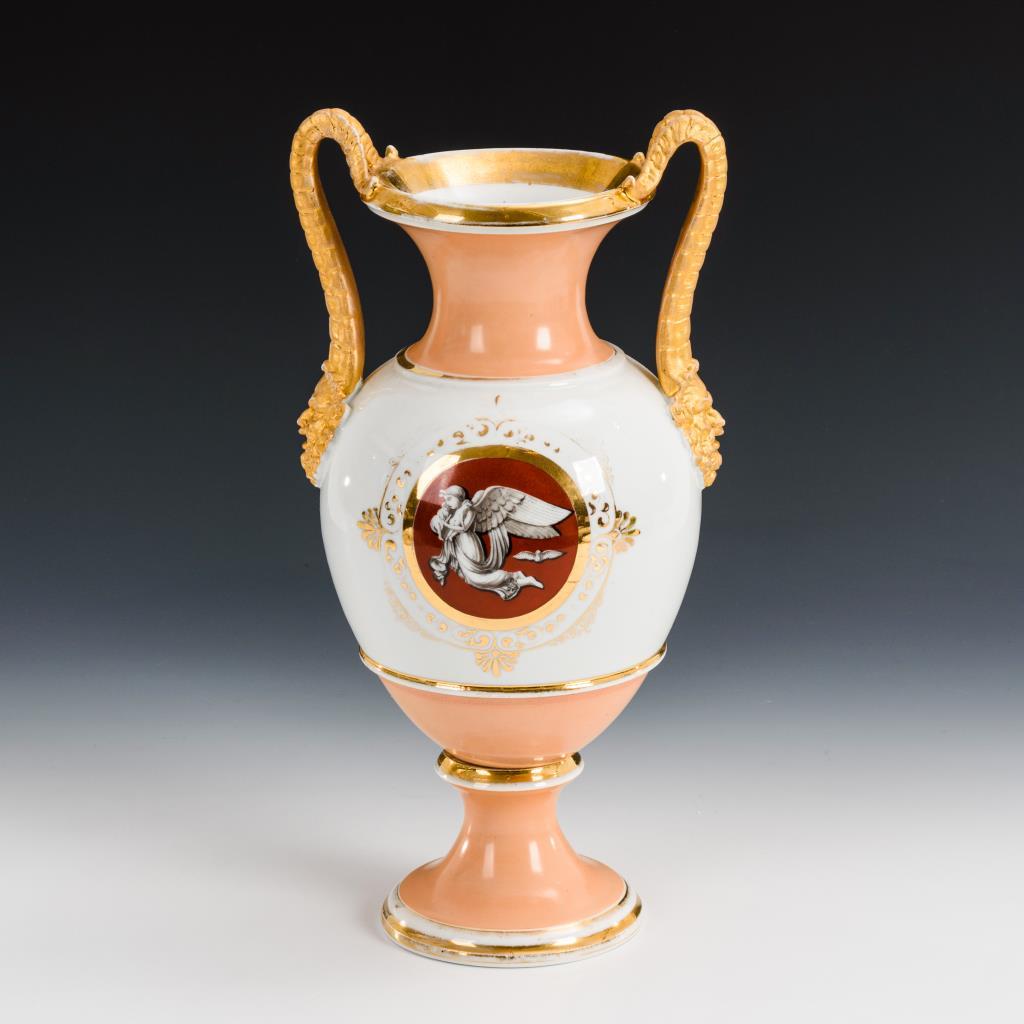 Ovoider Korpus mit zwei Maskaronhenkeln, Kraterhals, Rundfuß. Roséfarbener Teilfond, schauseitig ein Medaillon mit der allegorischen, grisaillegemalten Darstellung der Nacht. Partieller Goldabrieb.