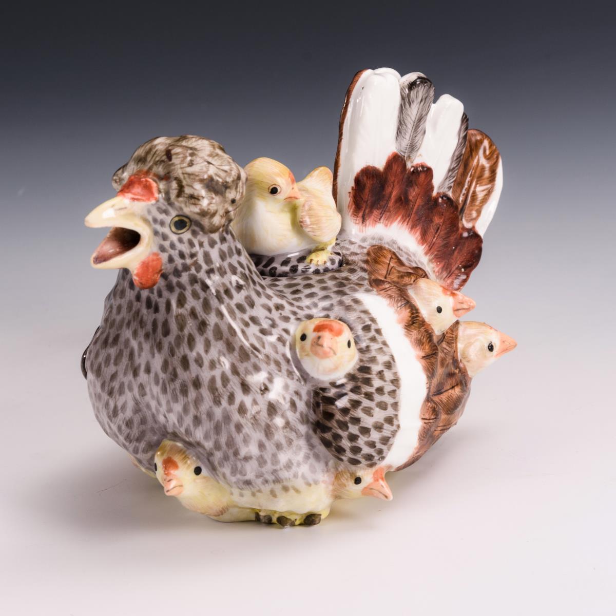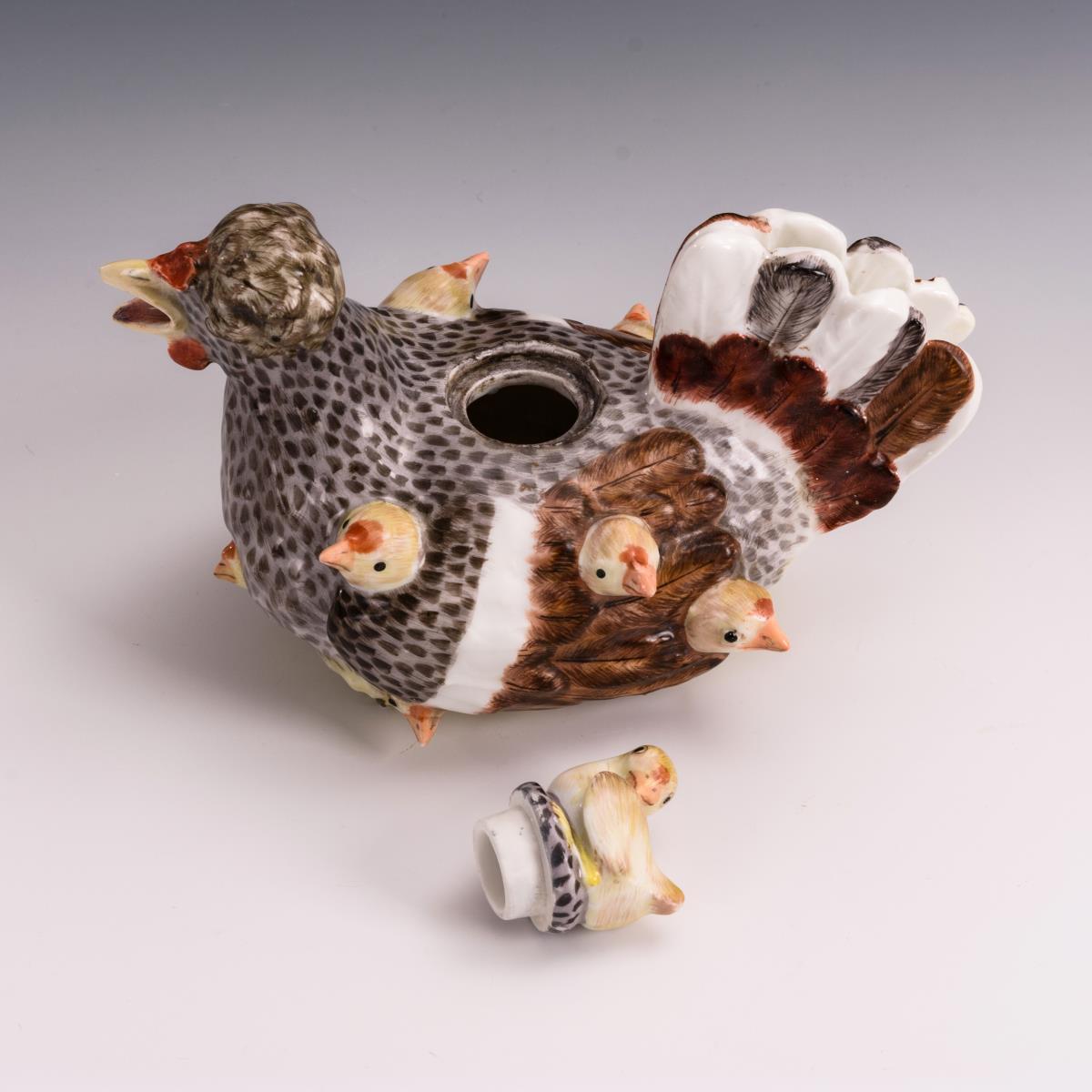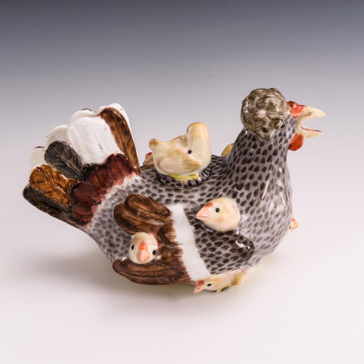 Teekanne in Gestalt einer sitzenden Henne, aus deren Gefieder die Küken herausschauen. Restaurierung am Stand, Einsatzring des Deckels, 2 Schwanzfedern, Hennenschnabel und 3 Kükenschnäbel restauriert, kleine Farbretuschen an 2 Kükenköpfen.