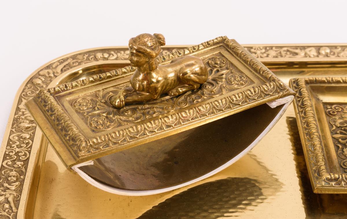 Kerzenleuchter, Fidibushalter und Löschwiege mit gleichem Reliefornament; Wiege zusätzlich mit applizierter Figur einer Sphinx. Tablett mit Putten im Reliefornament auf der Fahne. Wenige Alters-/Gebrauchsspuren.