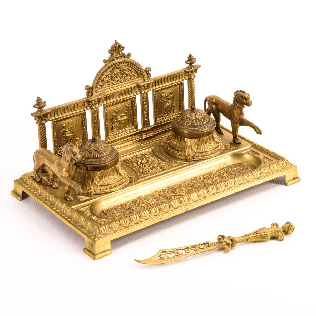 Schreibtischaufsatz mit überaus reichem Reliefornament, 2 montierten Greifenfiguren, 2 Tintenbehältern mit originialen Glaseinsätzen sowie 3 Reliefs mit Allegorien der Künste Malerei, Bildhauerei und Architektur auf der Rückwand. Dazu ein Brieföffner mit Frauenherme. Chips an den Gläsern.
