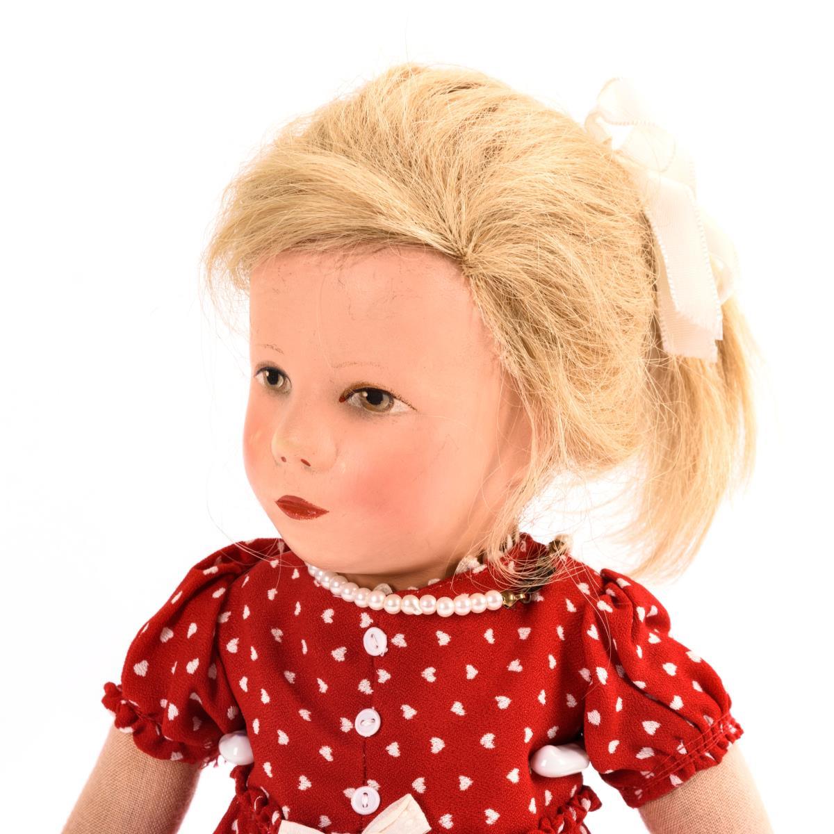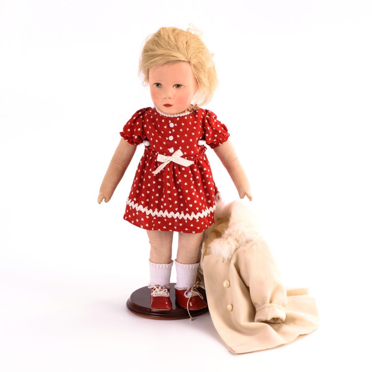 Bemalter Kurbelkopf aus Tortulon? oder Polystyrol, blonde Echthaarperücke. Schlanker Körper mit Schlenkerarmen, Beine mit Scheibengelenken. Rotes Kleid mit weißen Herzchen, heller Mantel mit Fellkragen, rote Schuhe. Nasenspitze berieben.