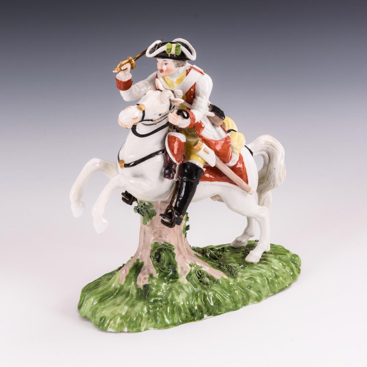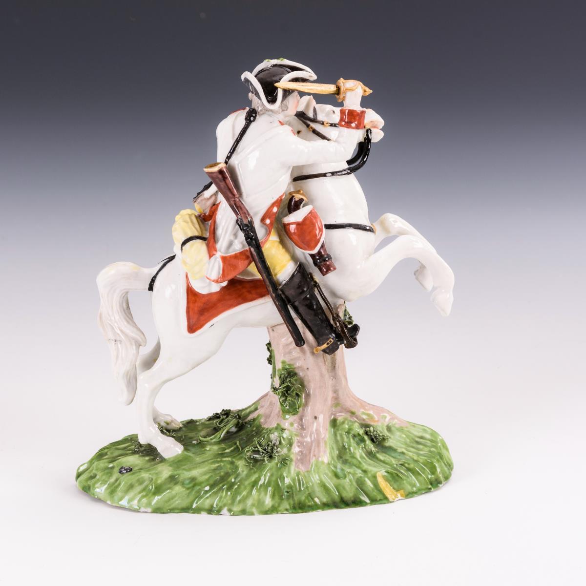 Jagdreiter auf einem Schimmel mit Flinte und Dolch. Beide Vorderbeine, Schweifansatz, Steigbügel, Zügel, Dolch, Gewehr und Hut restauriert.