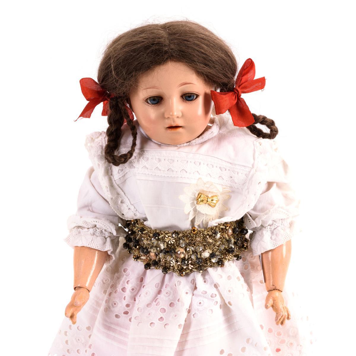 Brustkopf, blaue Glasaugen, Wimpern, offener Mund mit Zahnreihe, braune Mohairperücke. Schlanker Wachstuchkörper mit Gliederarmen aus Holz. Weißes Kleid, rosa Unterkleid. 3 Finger bestoßen.