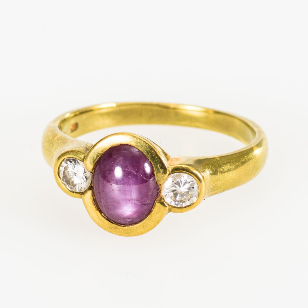 Zargengefasster Cabochon zwischen 2 Brillanten. Mittlere Schiene.