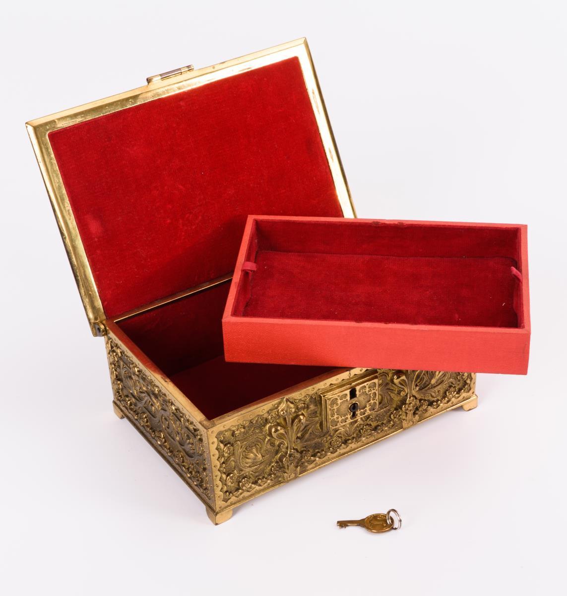 Allseits und auf dem Scharnierdeckel mit Tragebügel überaus reich floral reliefierte Schatulle mit Fallriegel in der Front. Innen mit rotem Samt ausgeschlagen sowie 1 herausnehmbares Fach. Etwas angelaufen.