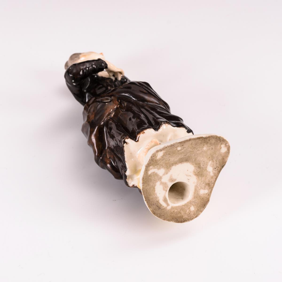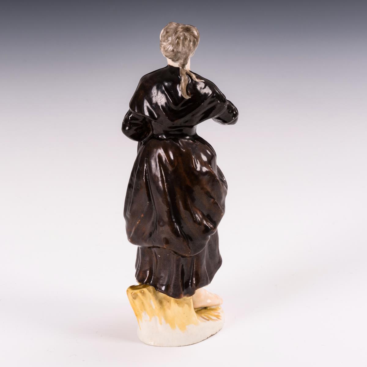 Auf einem knappen Sockel stehende Pilgerin mit Jakobsmuschel am Kleid. Glasur partiell krakeliert, minimale Glasurabplatzer.