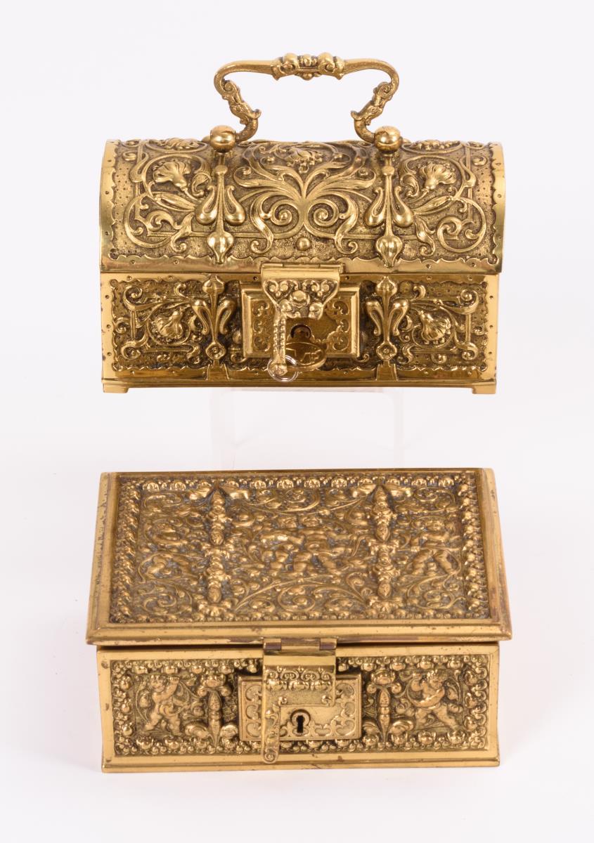 Quaderschatulle und Runddeckeltruhe, je allseits und auf den Scharnierdeckel reich reliefiert sowie Fallriegel in der Front. Innen mit rotem bzw. grünem Samt ausgeschlagen. 1 Schlüssel ergänzt.