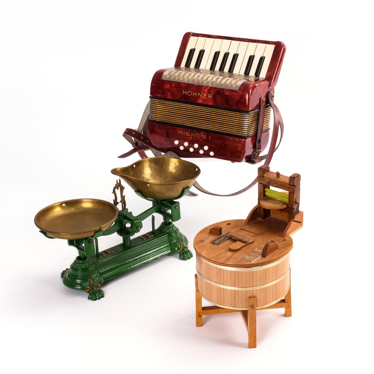 Rotes Akkordeon, Hohner "Mignon I". Funktionstüchtig. / Gründerzeit-Waage (bis 1 kg), mit grün nachlackiertem Sockel. / Waschkessel "Miele" aus Holz, mit Ergänzungen. Bespielt, mit Altersspuren und Überarbeitungen.