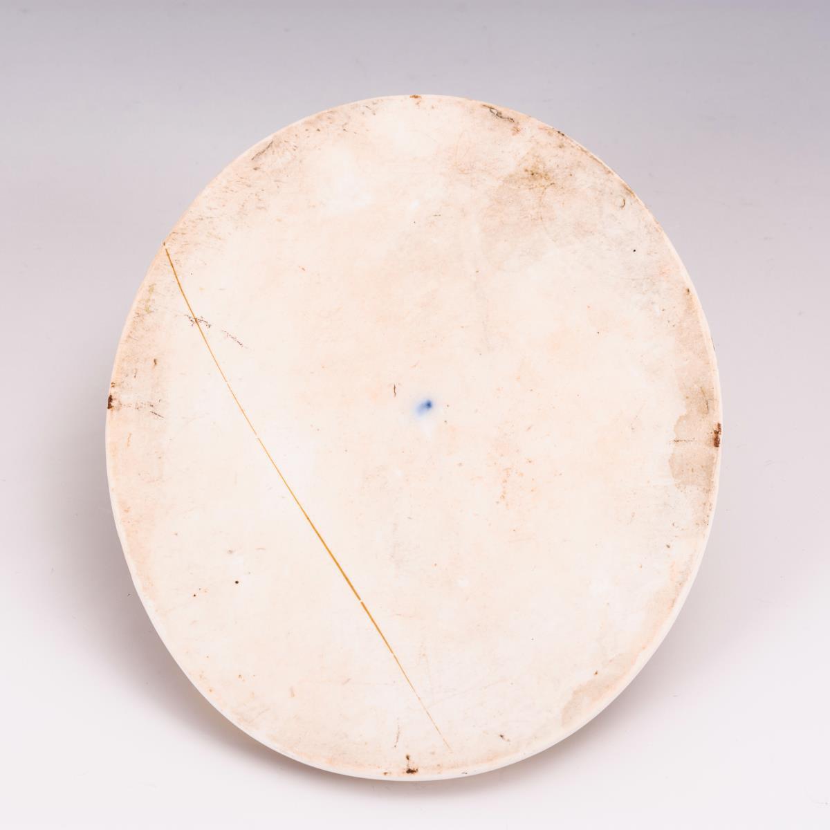 Ovale Plakette mit der Darstellung eines über Wolken schwebenden Putto mit Weinranken. Minimaler Goldabrieb.