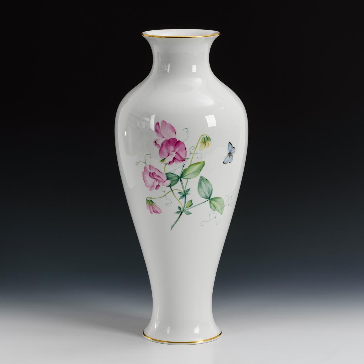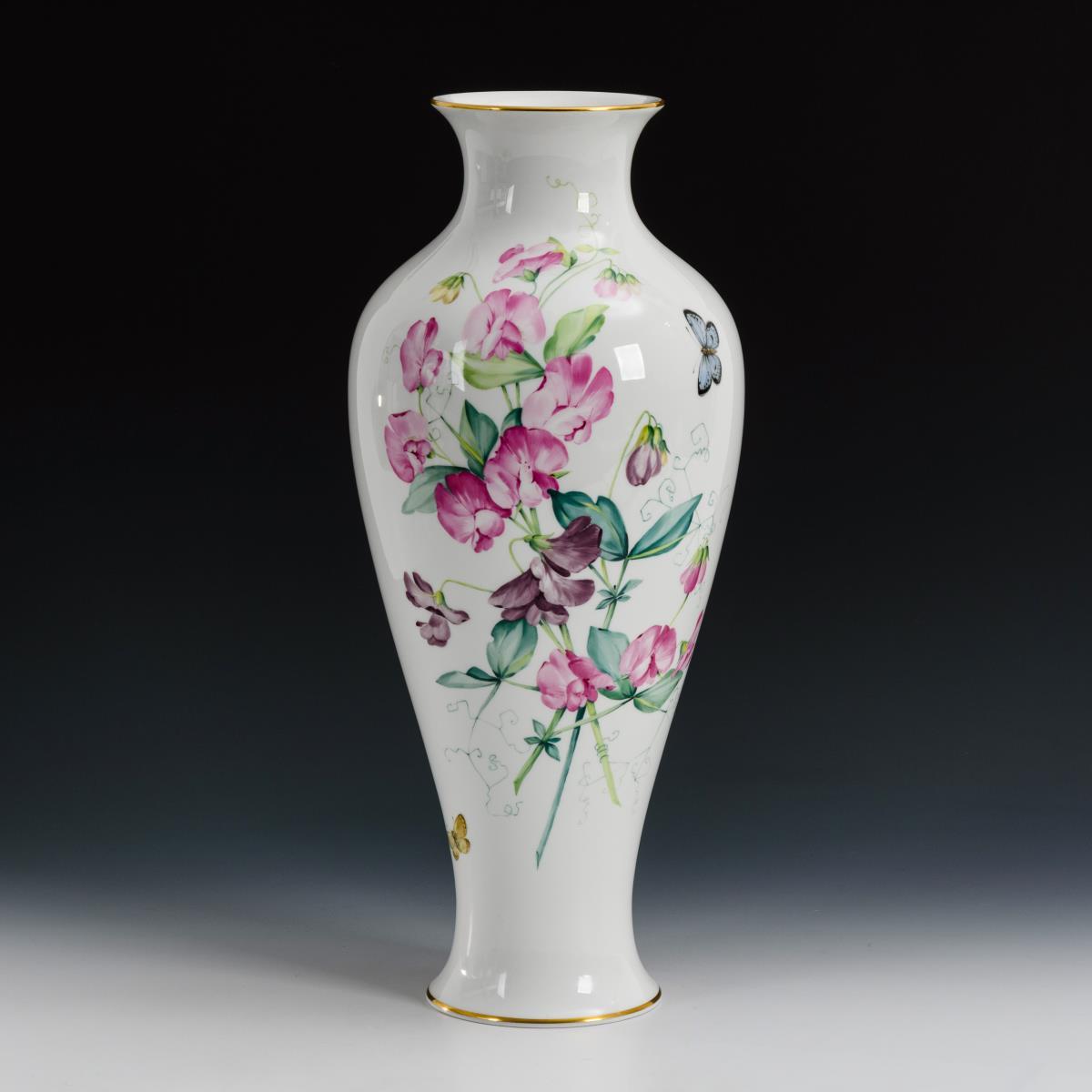Schlanke Balustervase mit einem Wickenbukett und Schmetterlingen.