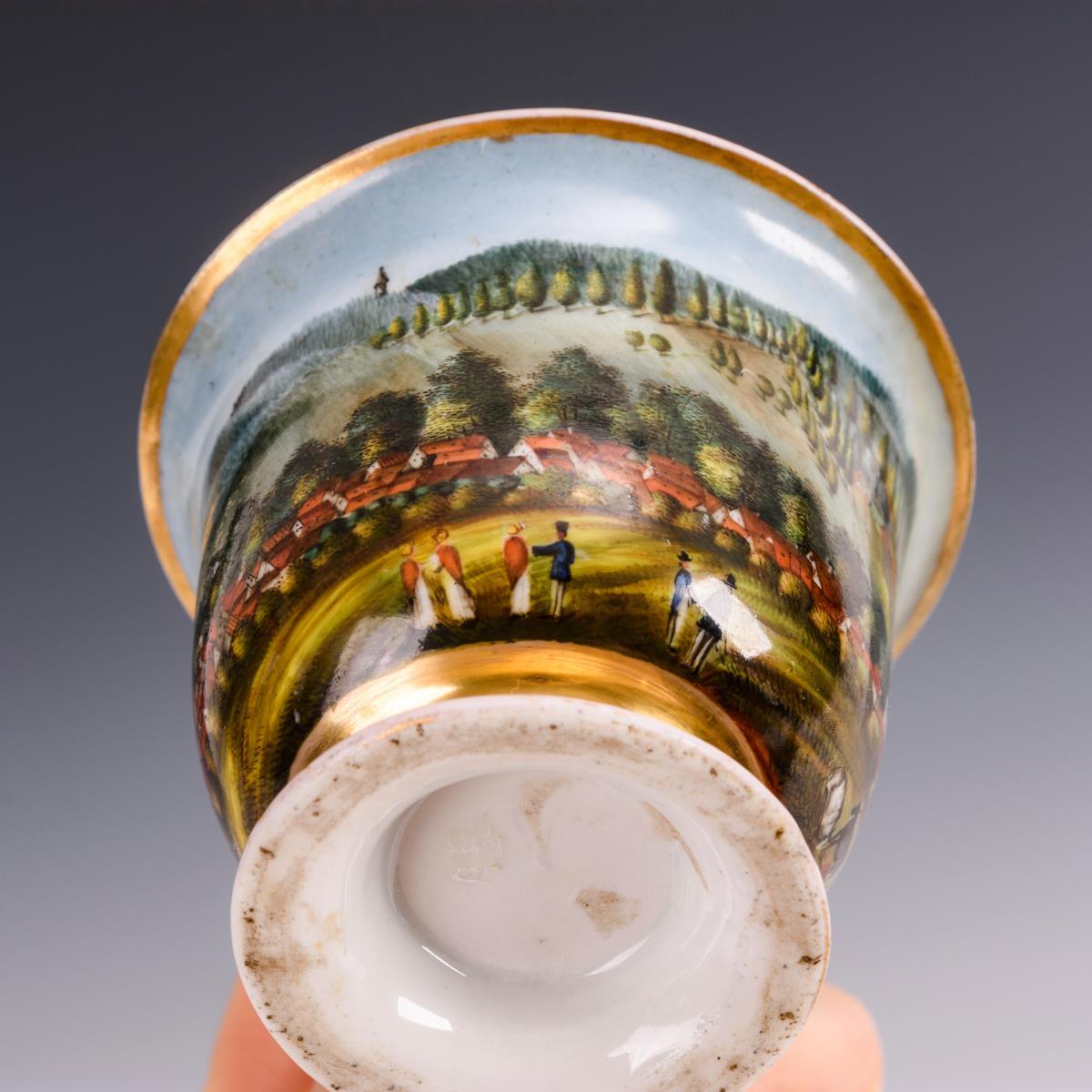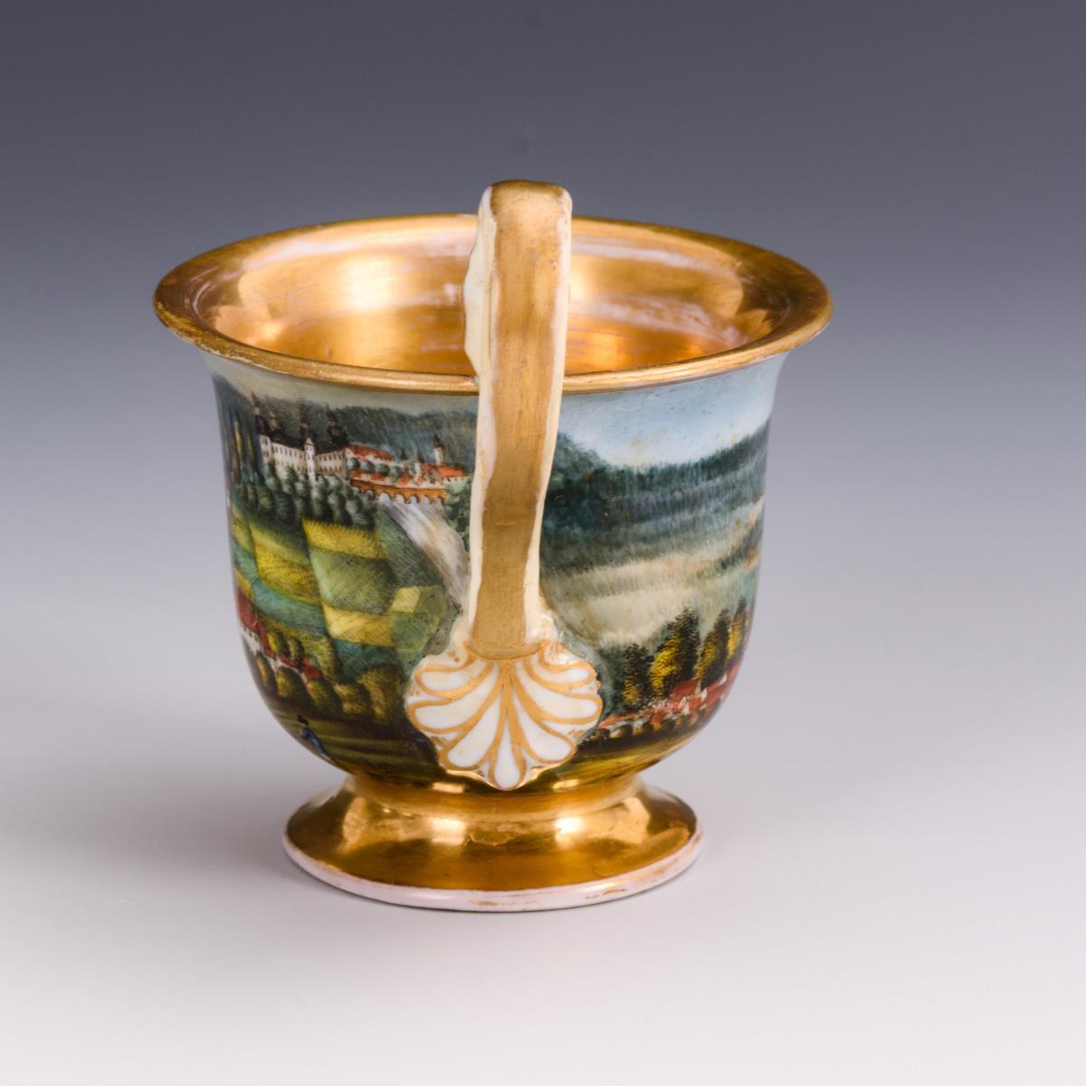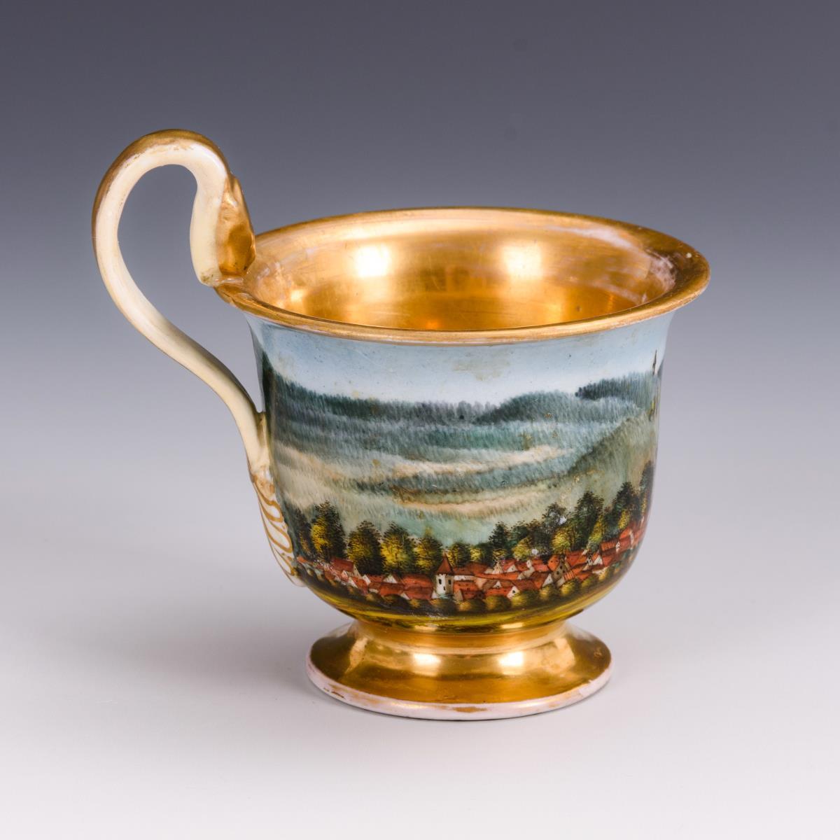Gefußte Glockentasse. Umlaufend eine Landschaftsansicht mit Stadt und Schloss (wohl Schloss Schwertberg/Oberösterreich). Ohne Untertasse. Henkel restauriert, 1 Randrestaurierung, partieller Goldabrieb.