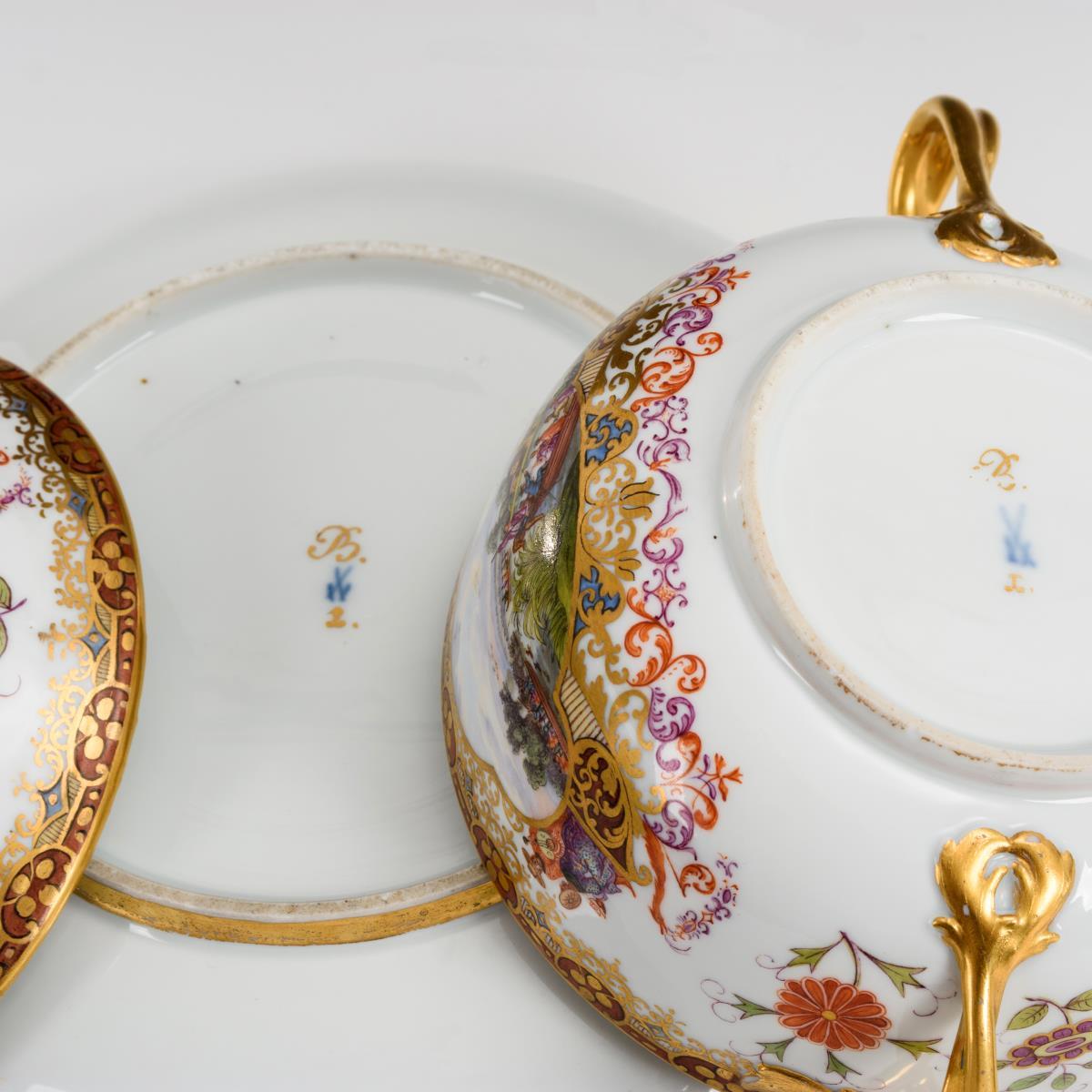 Imitierte Schwertermarke, um 1900. Im Stil der frühen Meissener Porzellane mit Vergolderzeichen "B" und "1" (Terrine und Teller) sowie Pressziffern.