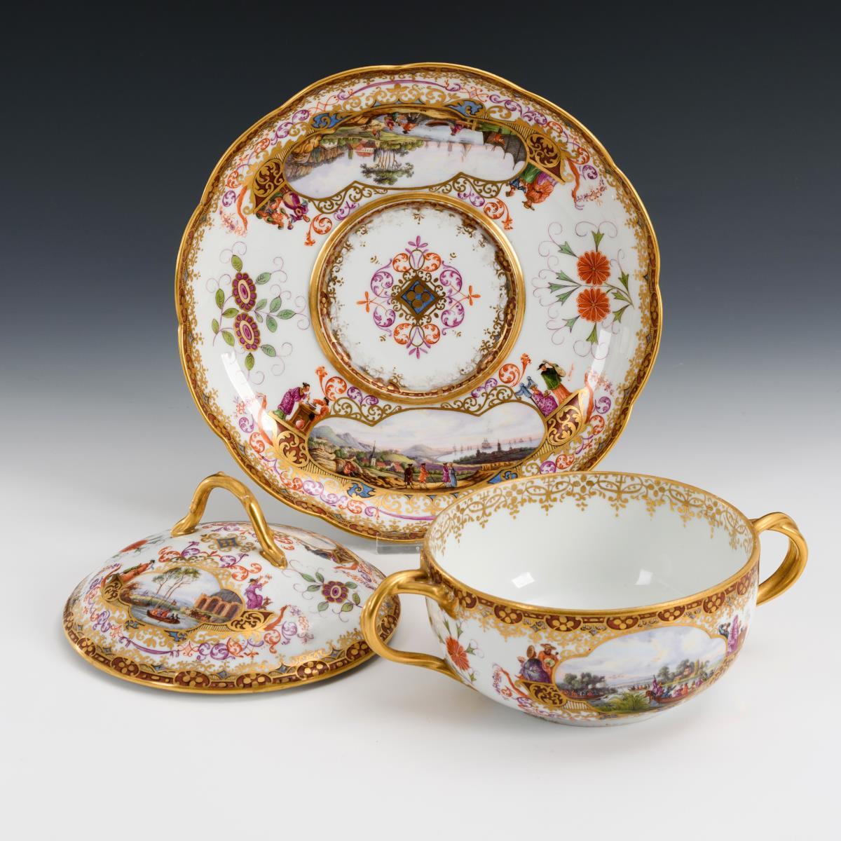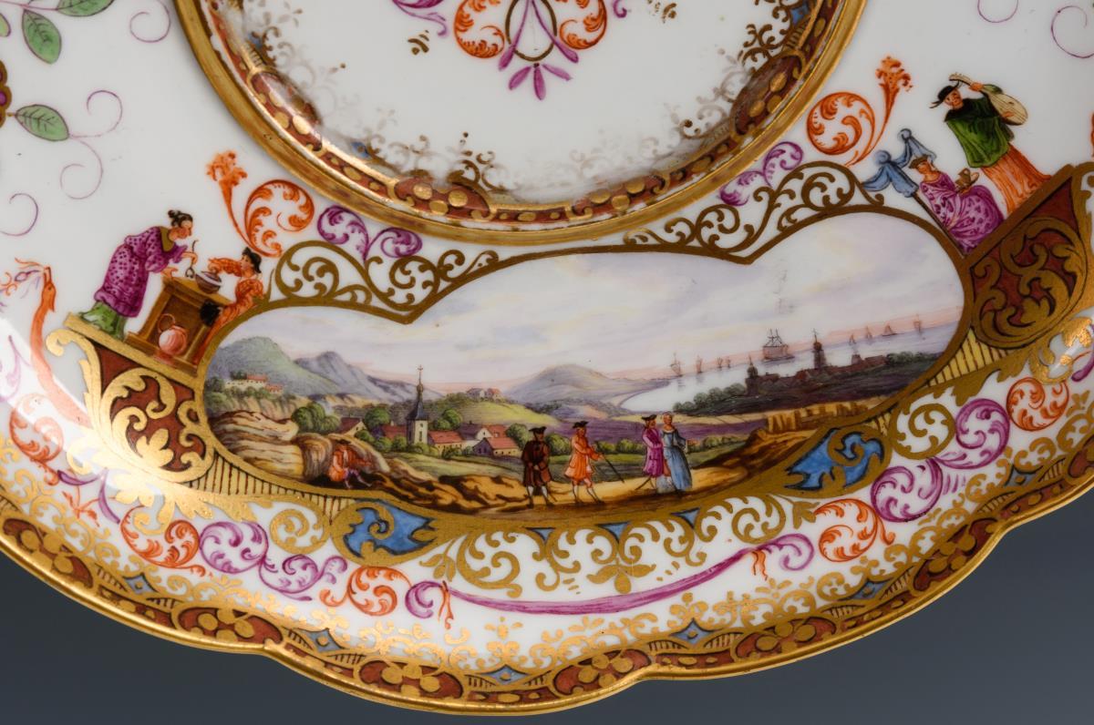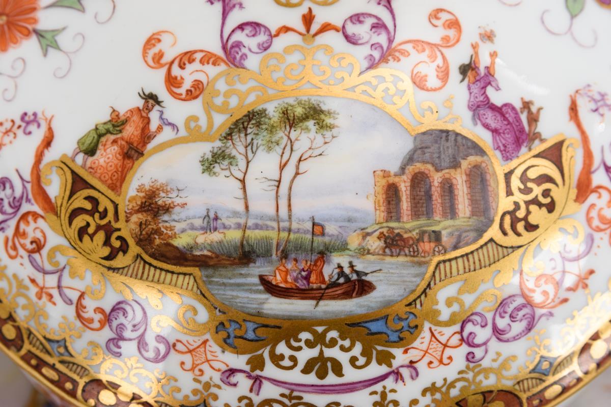 Terrine mit gewundenen Asthenkeln und Astgriffdeckel, mehrpassiges Presentoir. Auf Terrine, Deckel und Presentoir jeweils zwei von Laub- und Bandelwerk umgebene Vierpasskartuschen mit einer Fischerszene sowie der Darstellung von Vergnügungen der höfischen Gesellschaft (z.B. Entenjagd, Blinde-Kuh-Spiel, Hirschjagd). Auf den die Kartuschen flankierenden Konsolen kleine Chinesenfiguren. Partiell minimaler Goldabrieb.