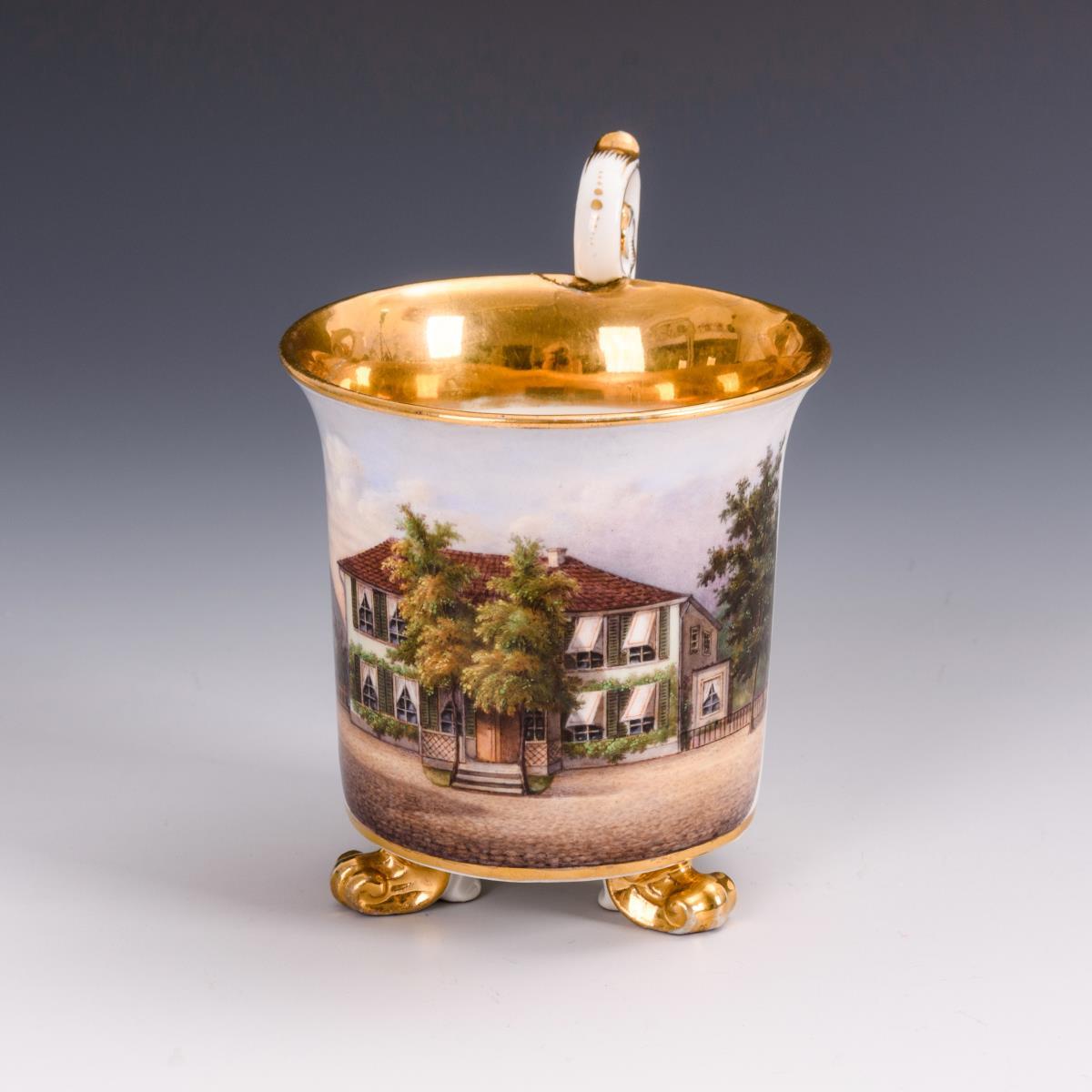 Kratertasse mit drei Tatzenfüßen und Palmettenhenkel. Schauseitig die Ansicht eines Landhauses. Henkel geklebt, minimaler Goldabrieb. Ohne Untertasse.