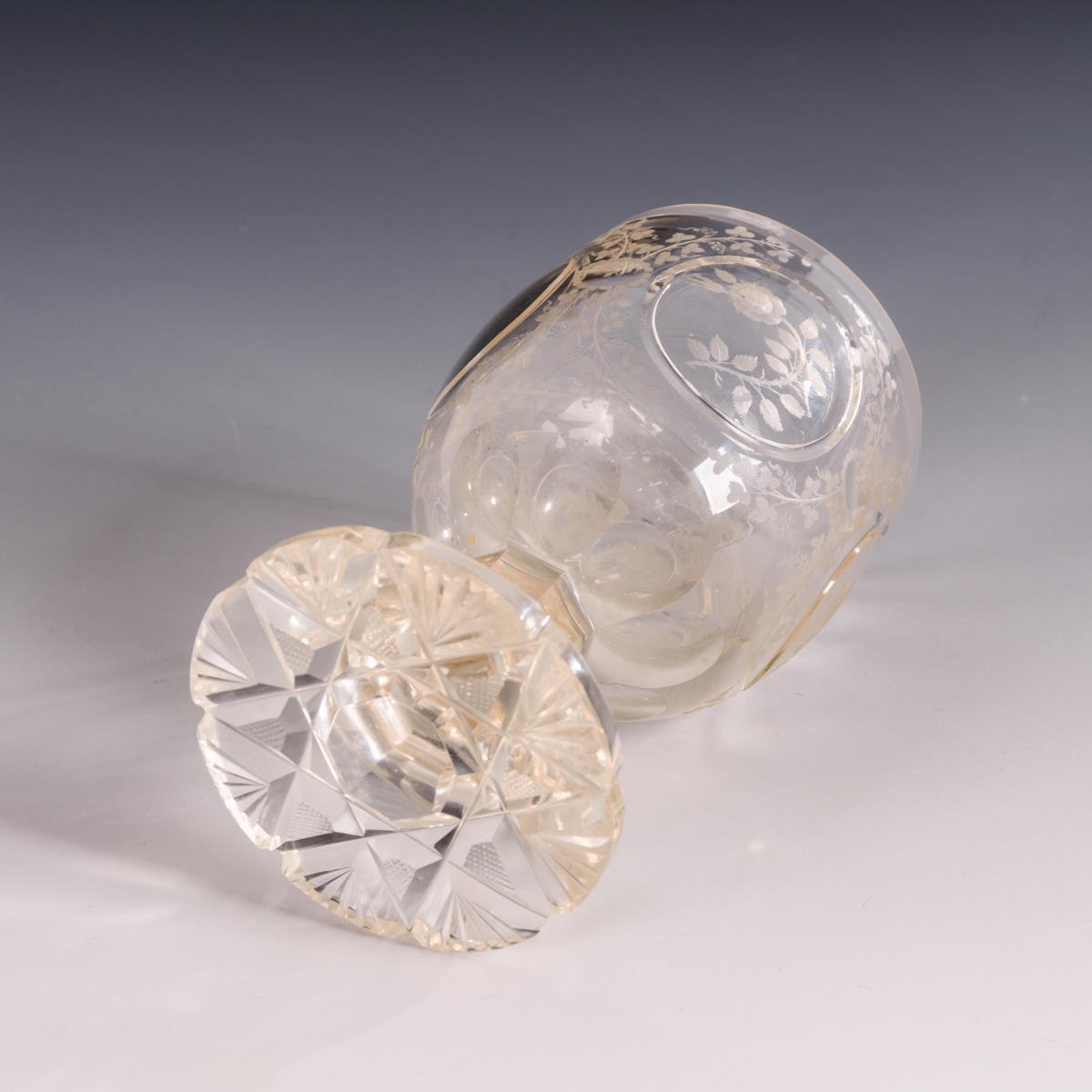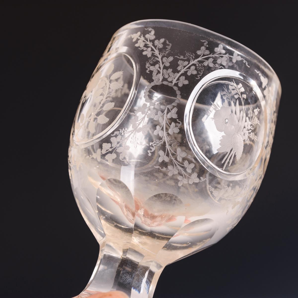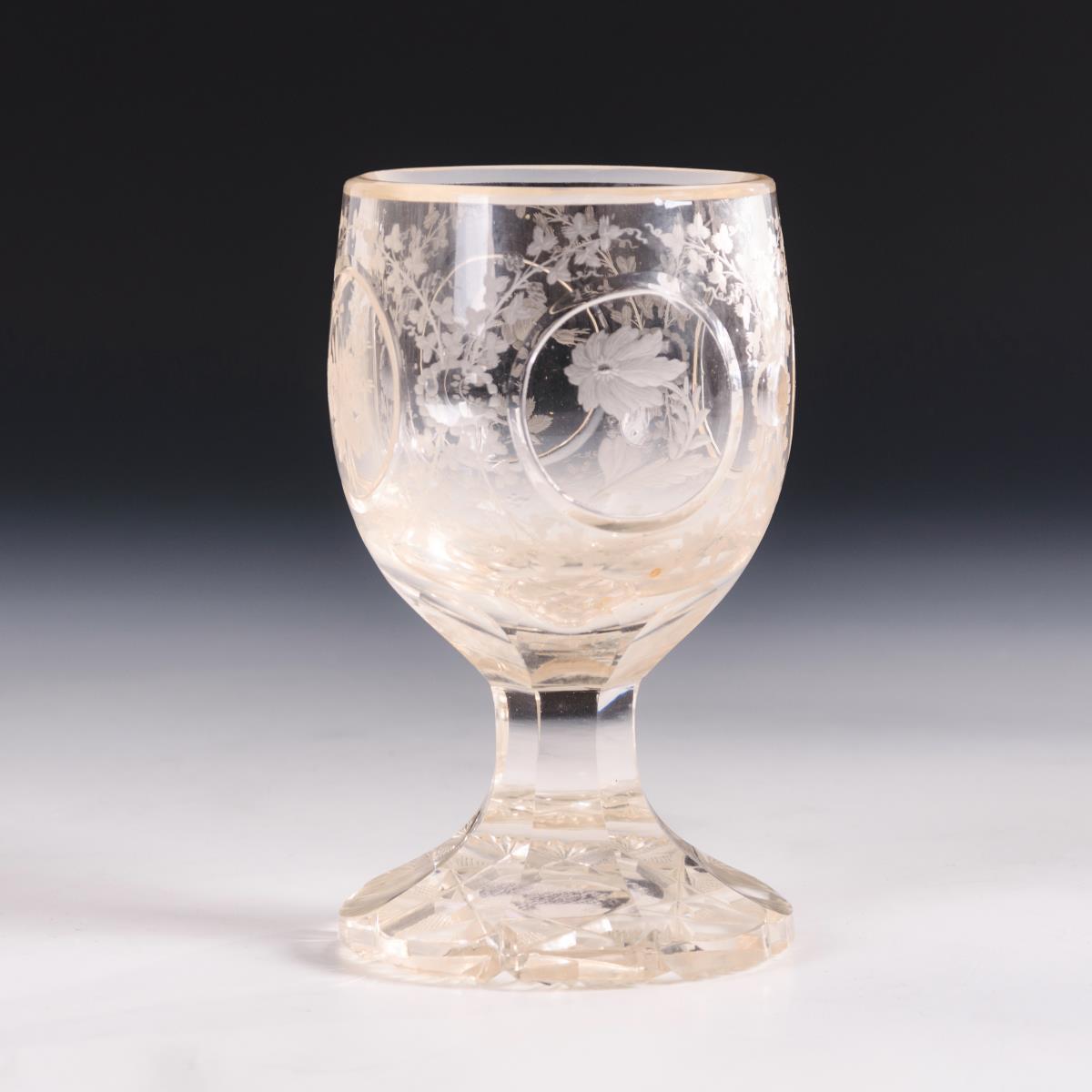 Bauchige Kuppa, facettierter, massiver Schaft und mehrpassiger Fuß mit Bodenrosette. Auf der Kuppa fein mattgeschliffenes, teils geblänktes Floraldekor sowie vier Olivenlinsen. Beschleifung am Mündungsrand.