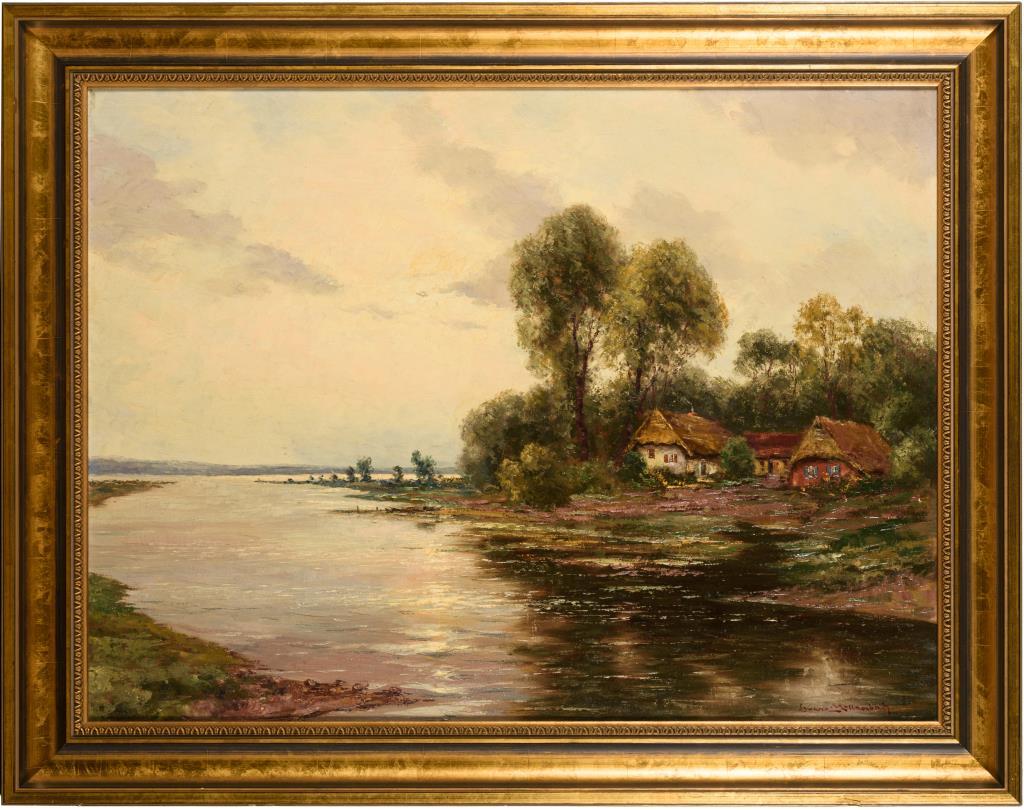 Reetgedeckte Häuser nahe dem Ufer an der Flussmündung.