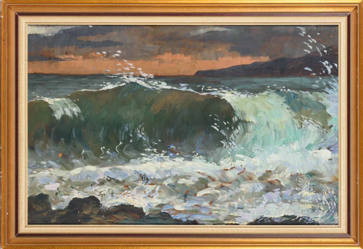 Darstellung einer großen brechenden Welle am Strand mit Blick übers Meer unter wolkigem Himmel. Leichte Altersspuren.
