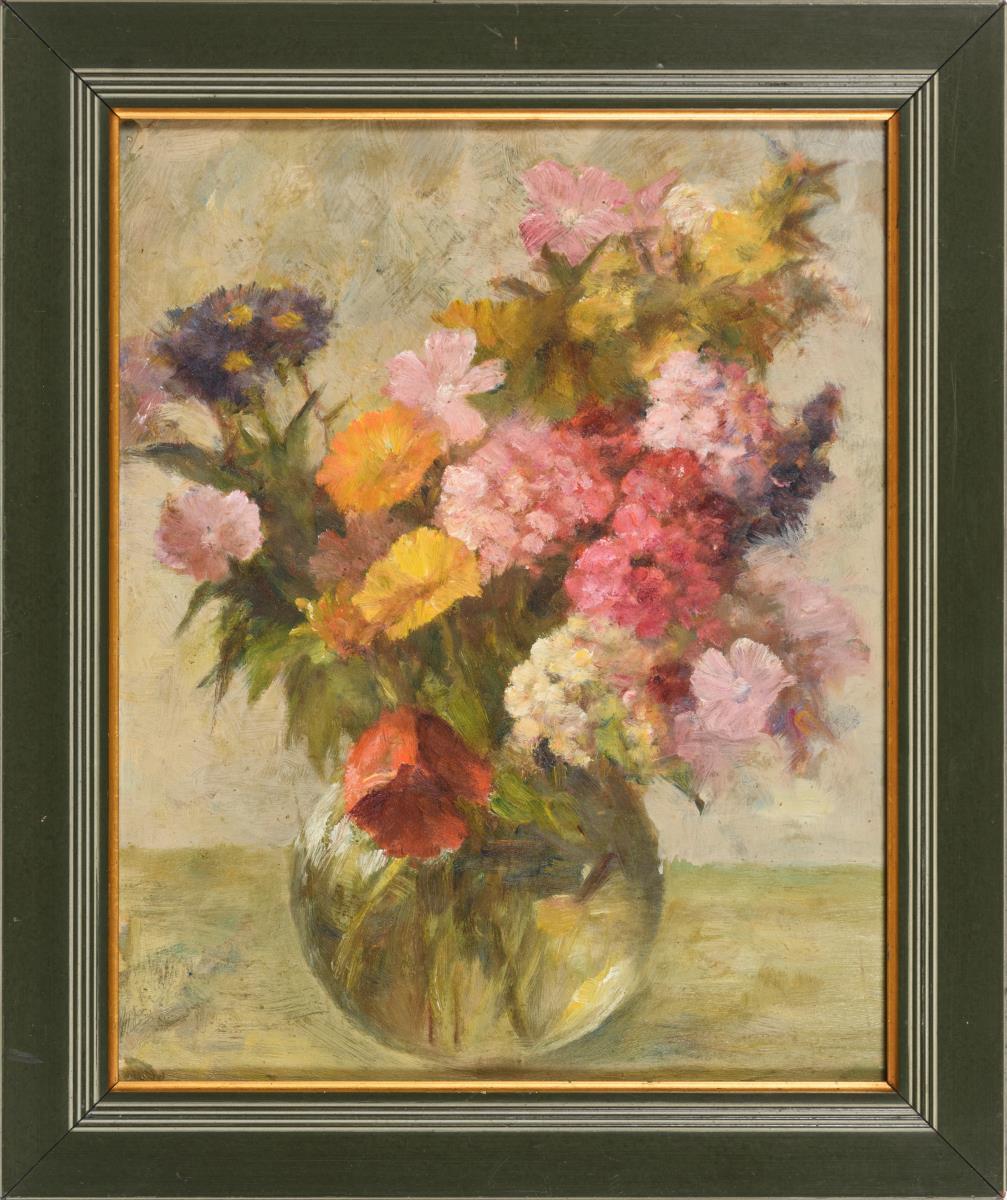 Verschieden farbige Blumen in bauchiger Glasvase.