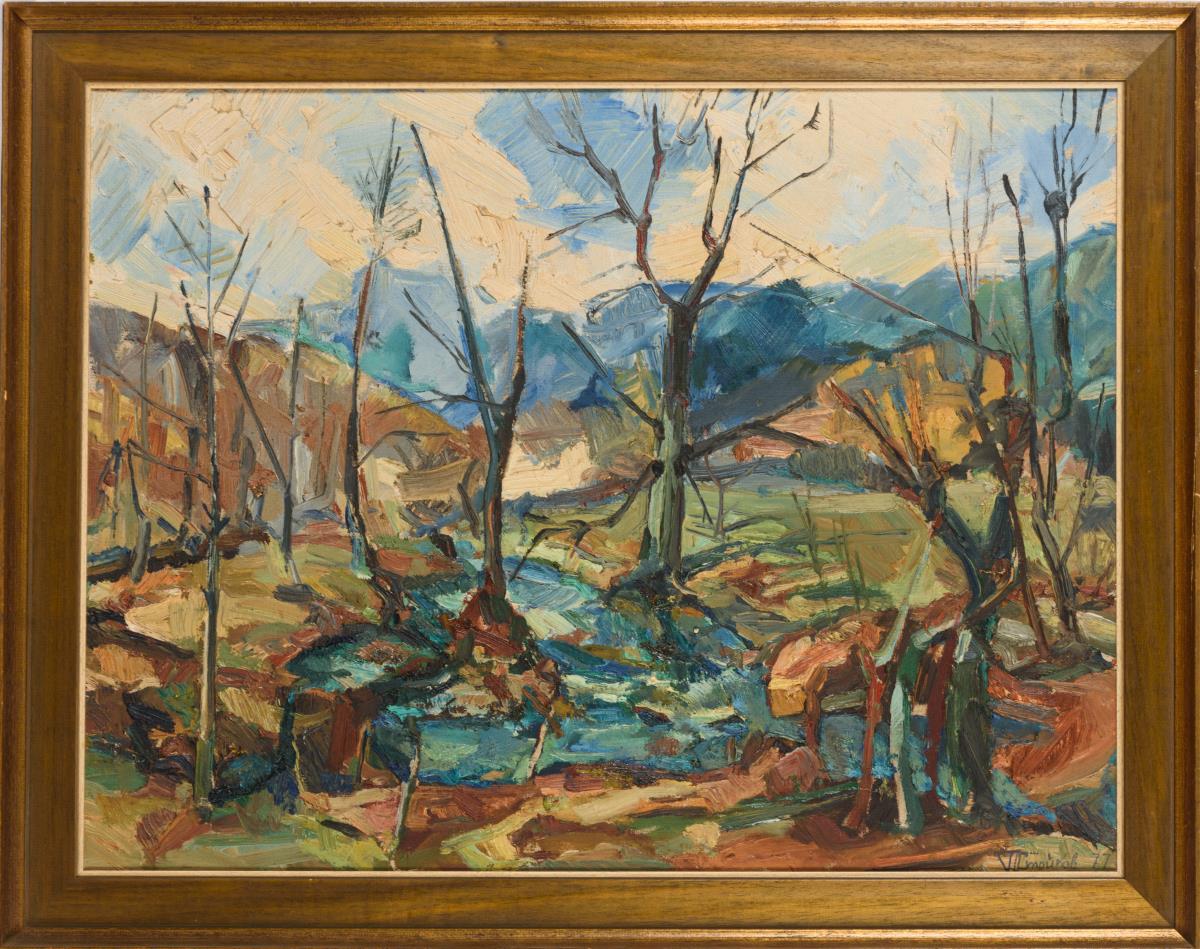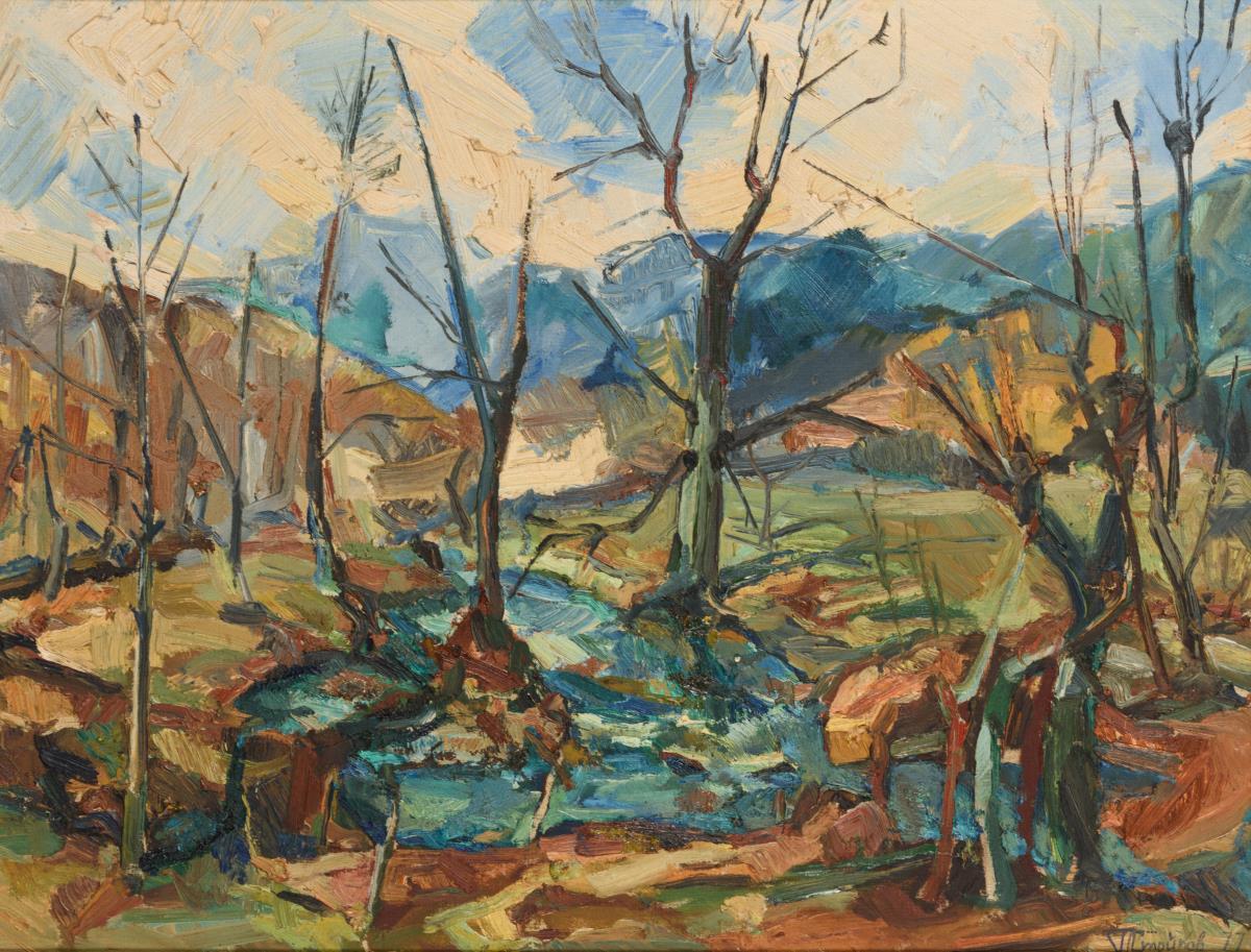 Teils pastos gemalte Berglandschaft mit kahlen Bäumen unter bewölktem Himmel.