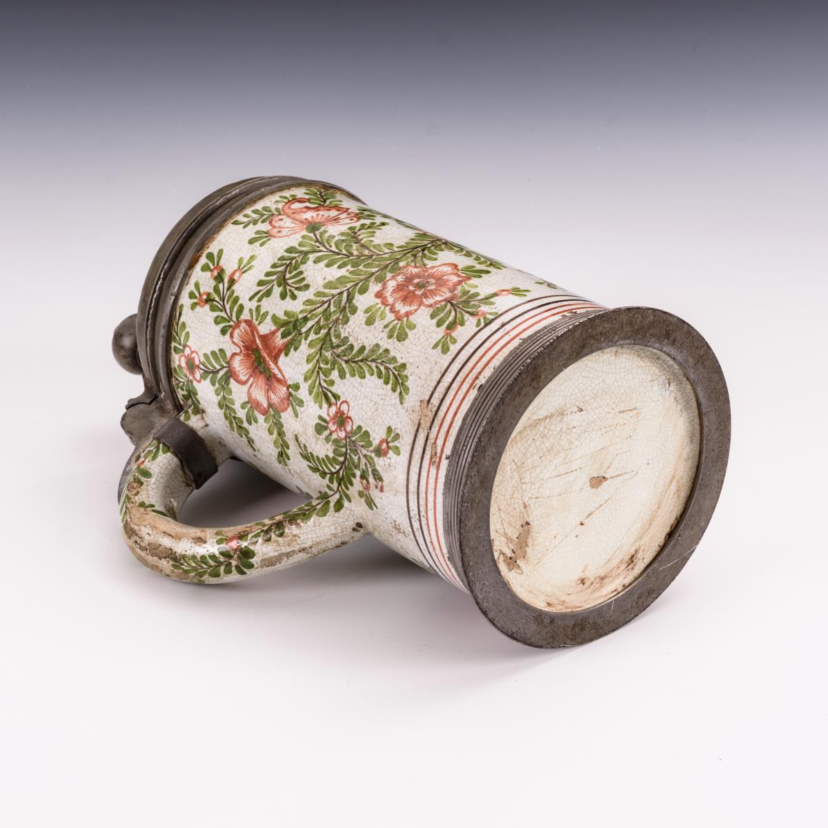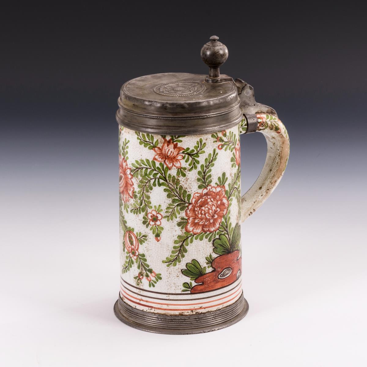 Zylinderkrug mit Wulsthenkel. Flacher Zinndeckel mit Rosenplakette, Kugeldrücker, schwach handgraviert "AR 1801", Zinnstandring. Glasurbereibungen, Alters- und Gebrauchsspuren.