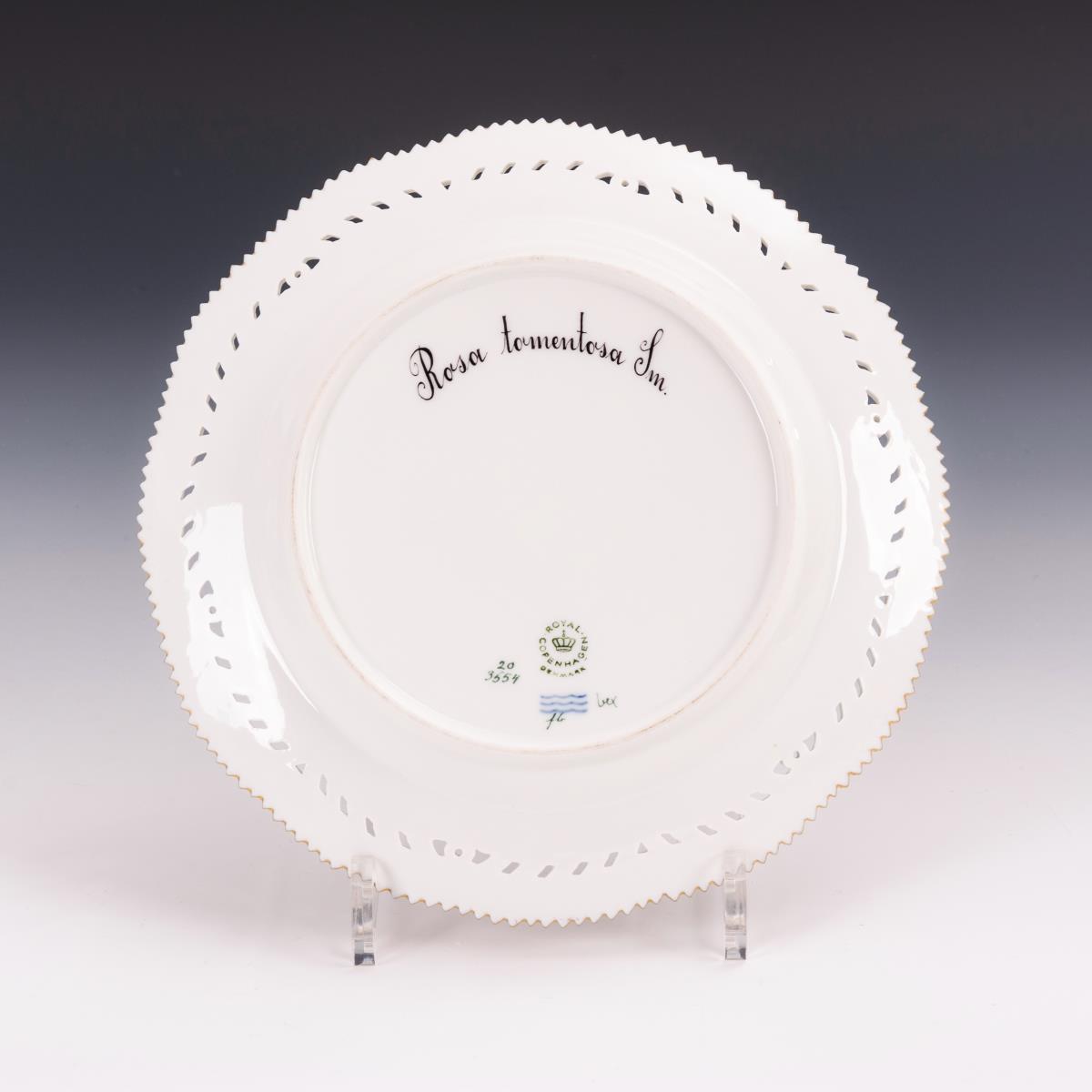Teller mit durchbrochener Fahne und Zackenrand. Im Spiegel die Darstellung einer Hundsrose, unterseitig lateinisch bezeichnet.