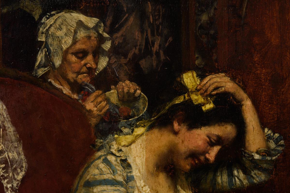 Junge Frau beim Testen einer gelben Schleife im Haar auf einem ausladenden Louis-Philippe-Armlehnstuhl vor einem spätbarocken Schrank mit zwei bauchigen Vasen auf dem Gesims. Minimale Altersspuren.