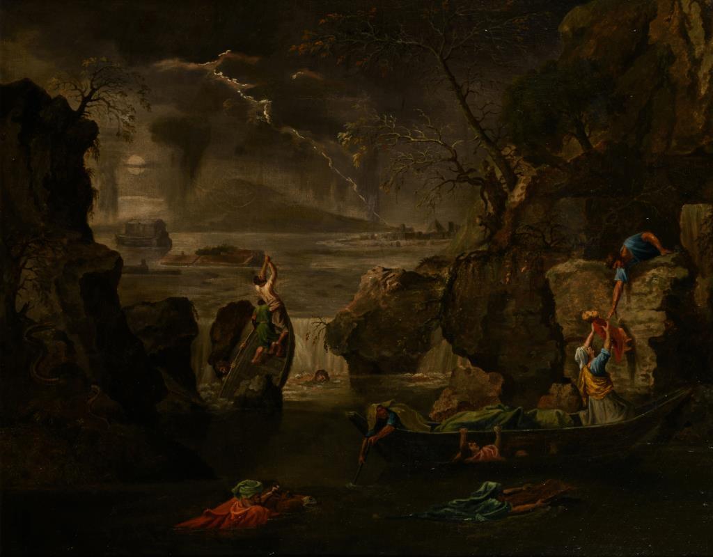Mehrere Menschen versuchen sich nahe der Pyramiden vor den Wassermassen in Sicherheit zu bringen, während die Arche hinter den Hausdächern auf dem Wasser schwimmt. Eine kleine restaurierte Stelle mit Hinterklebung.