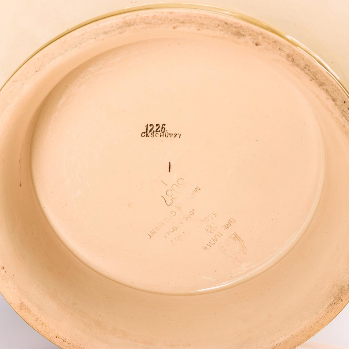 Elfenbeinfarbenes Steinzeug, teils grün glasiert, mit farbigem Umdruckdekor. H ca. 35 cm, Ø Teller 44 cm.