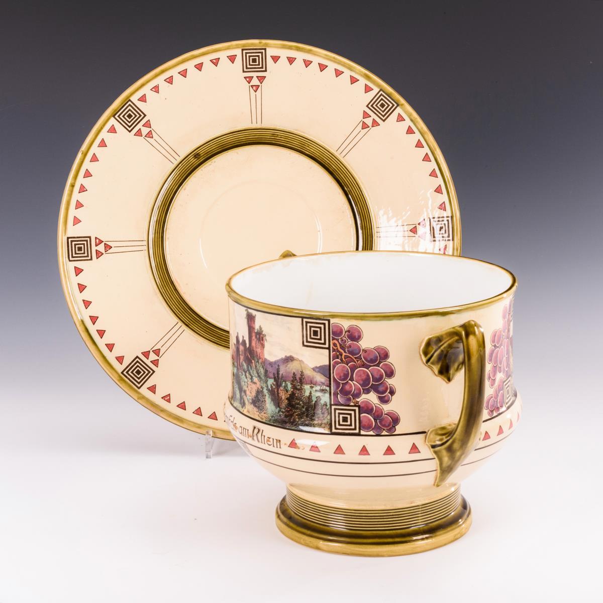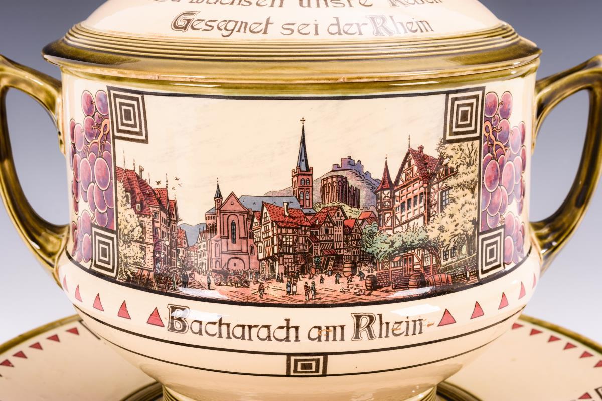 Zwei-Henkel-Gefäß mit Rundfuß, Deckel mit Asthenkel, auf großem Unterteller. Umlaufend Burgen- und Stadtansicht von Bacharach und Ehrenfels, ornamentaler Jugendstil- und Weintraubendekor mit Leitspruch. Minimale Alters- und Gebrauchsspuren.