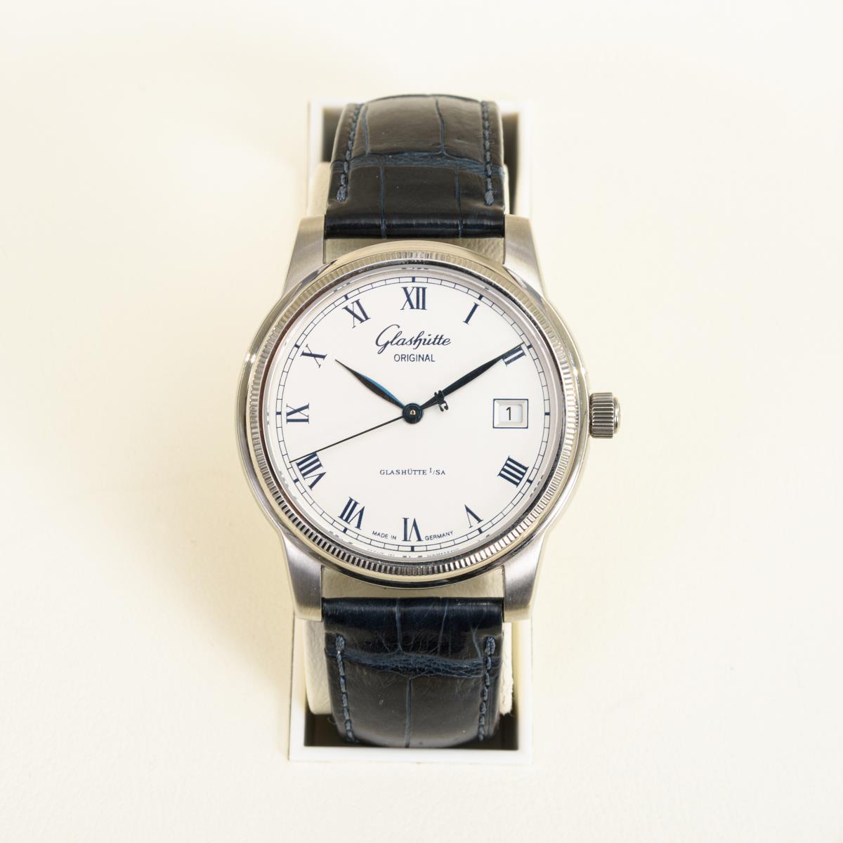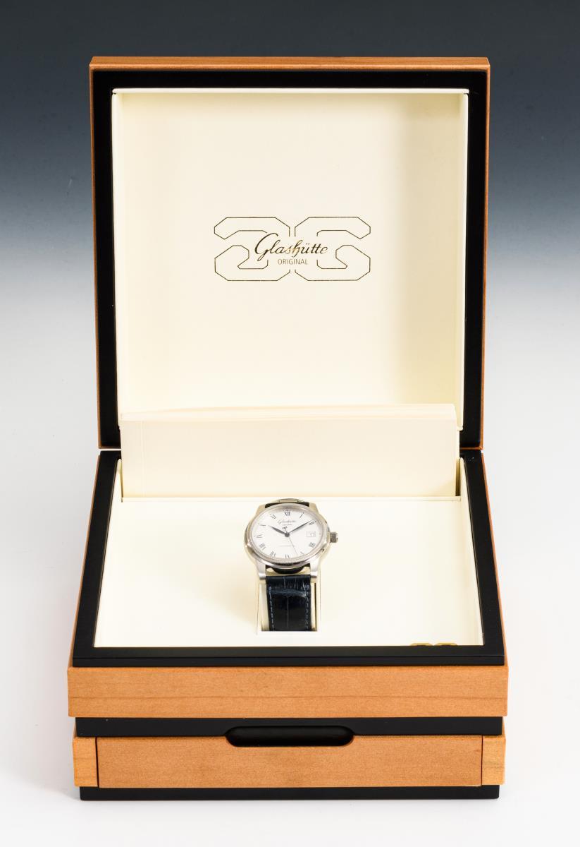 In Original-Holzschatulle mit Garantieschein vom 05.02.2000 und Glashütte Original-CD, 2 Ersatzarmbänder.