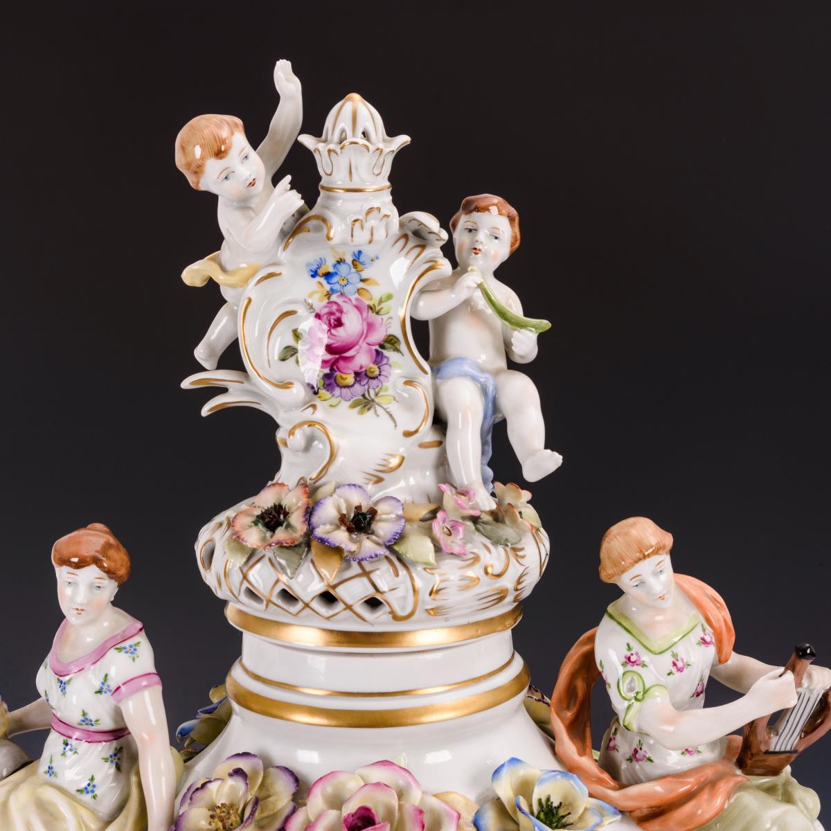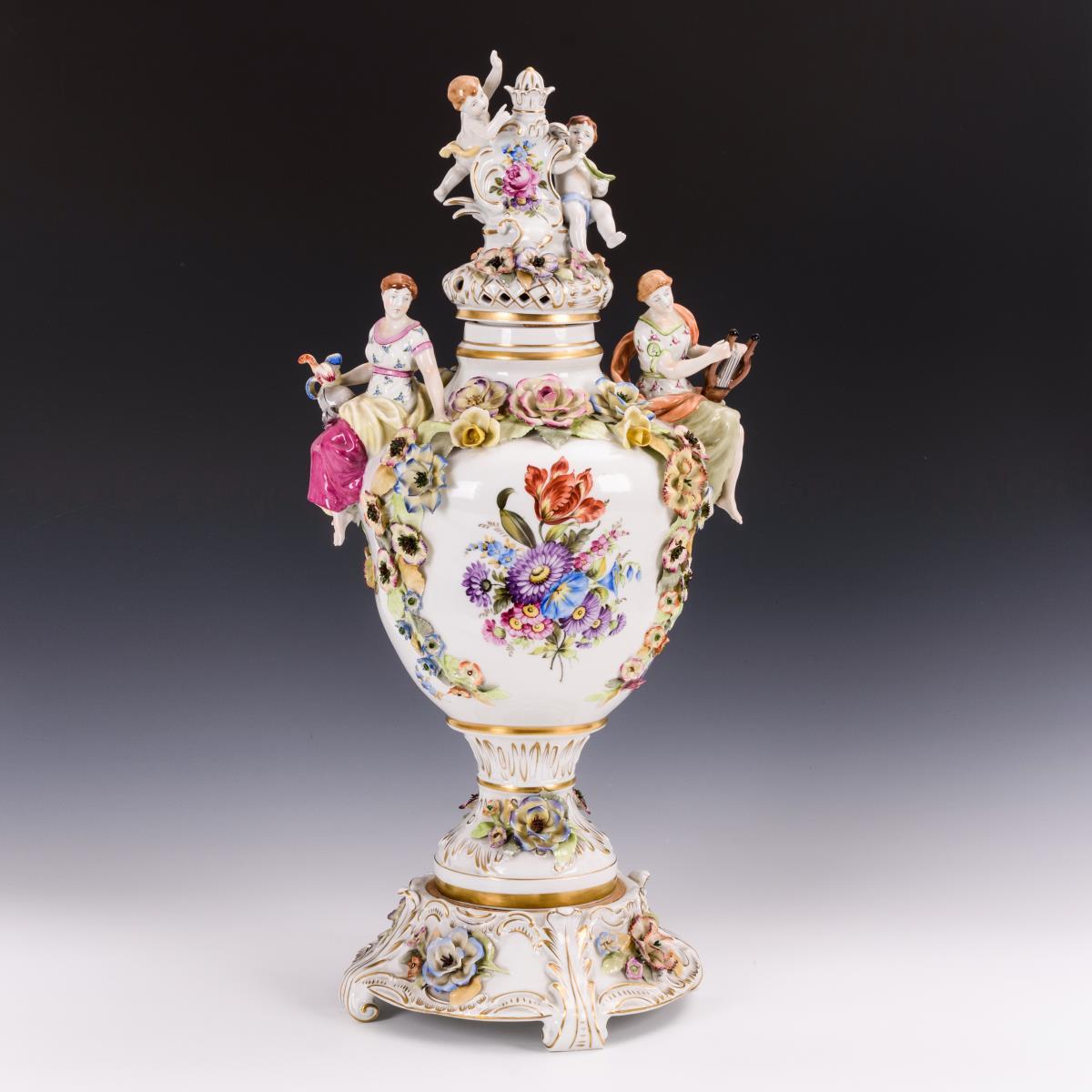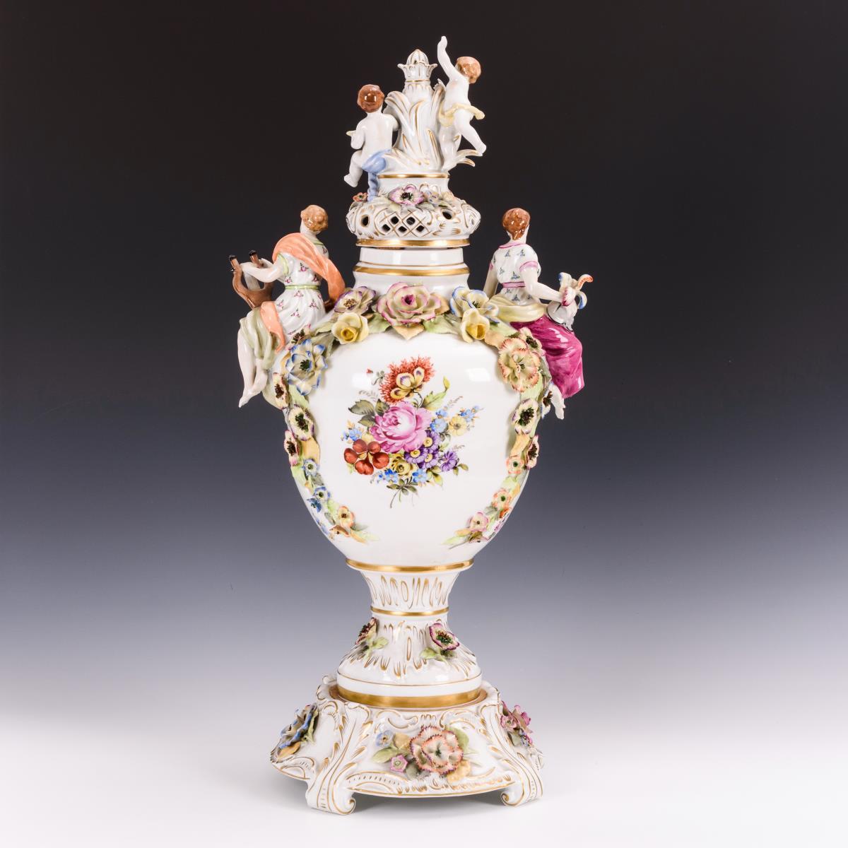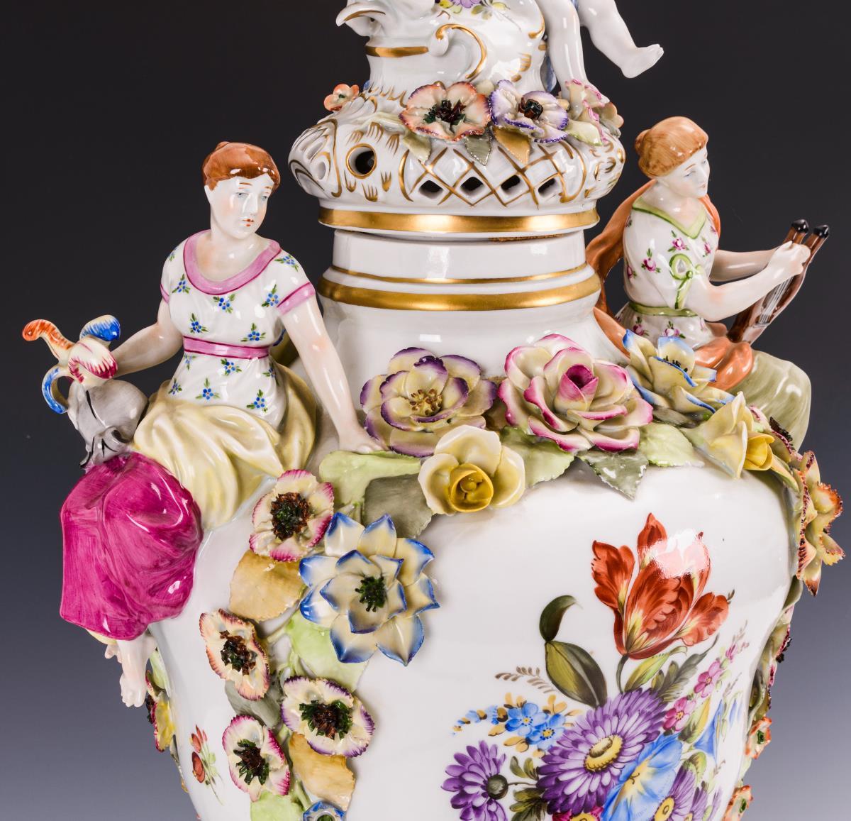 Balustervase mit durchbrochenem Deckel, Blütenbelag sowie Figurenschmuck. Partielle Bestoßungen am Belag.