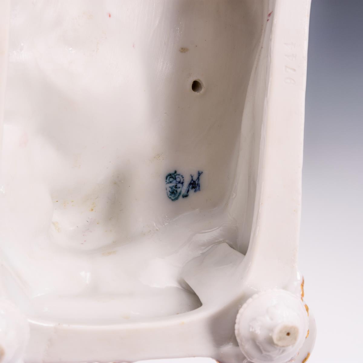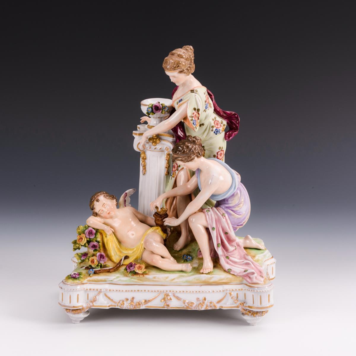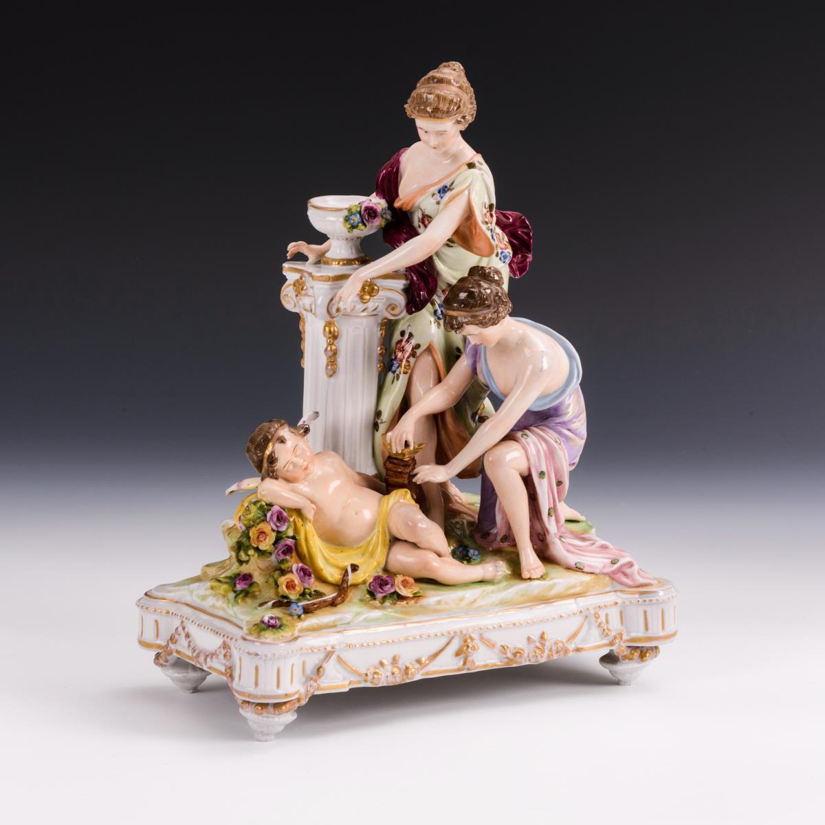 Zwei an einer Säule stehende Frauen, am Fuße der Säule ein Amorknabe schlafend. 1 Finger restauriert, minimaler Goldabrieb.