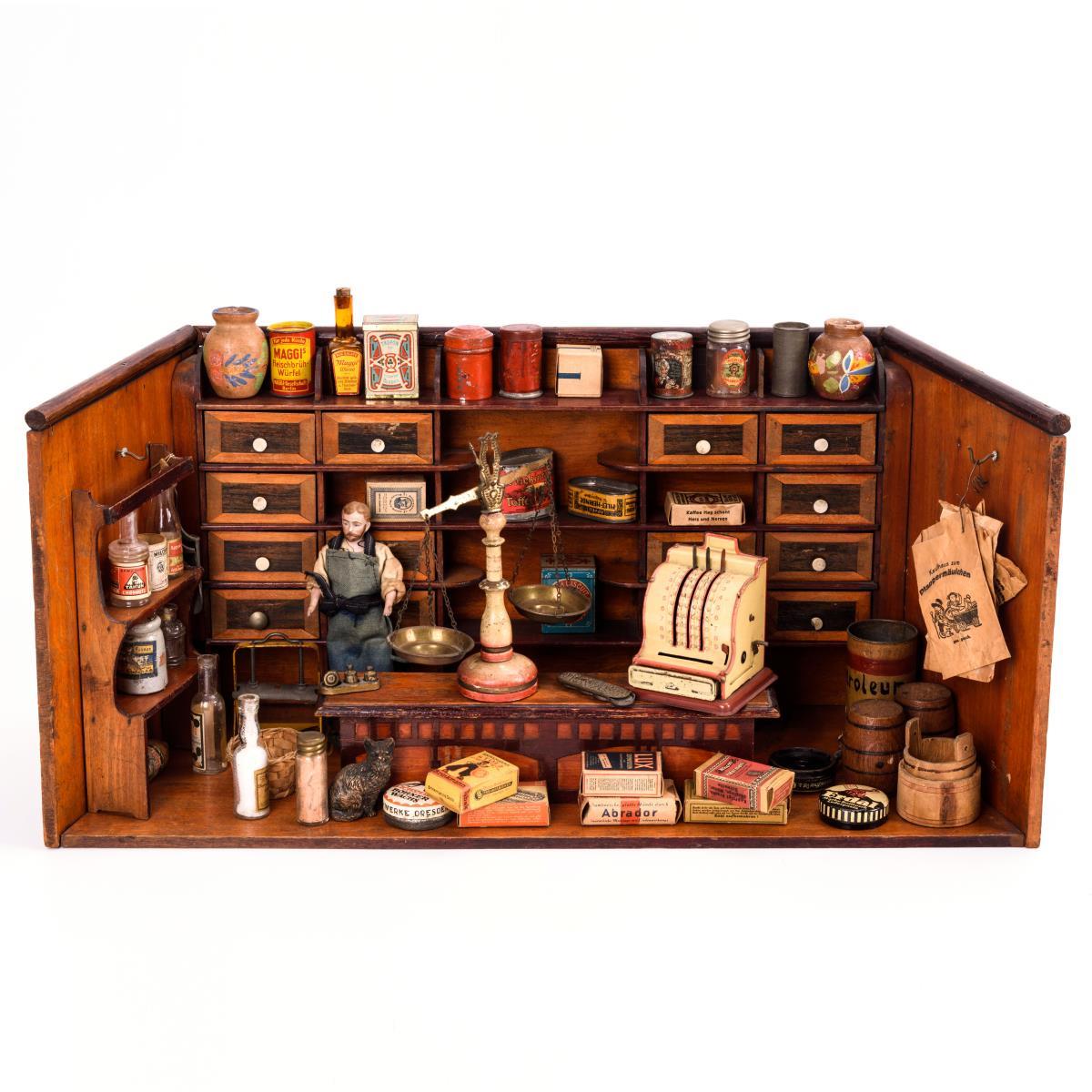 Trapezförmiges Gehäuse mit 14-schübigem Ladeneinbau, Wandregal und loser Theke. Mit Gründerzeit-Waage, Blechkasse sowie verschiedenen Dosen, Schachteln und Flaschen. Dazu Puppenstubenpuppe mit modelliertem Bart als Verkäufer. Altersspuren, kleine Defekte.
