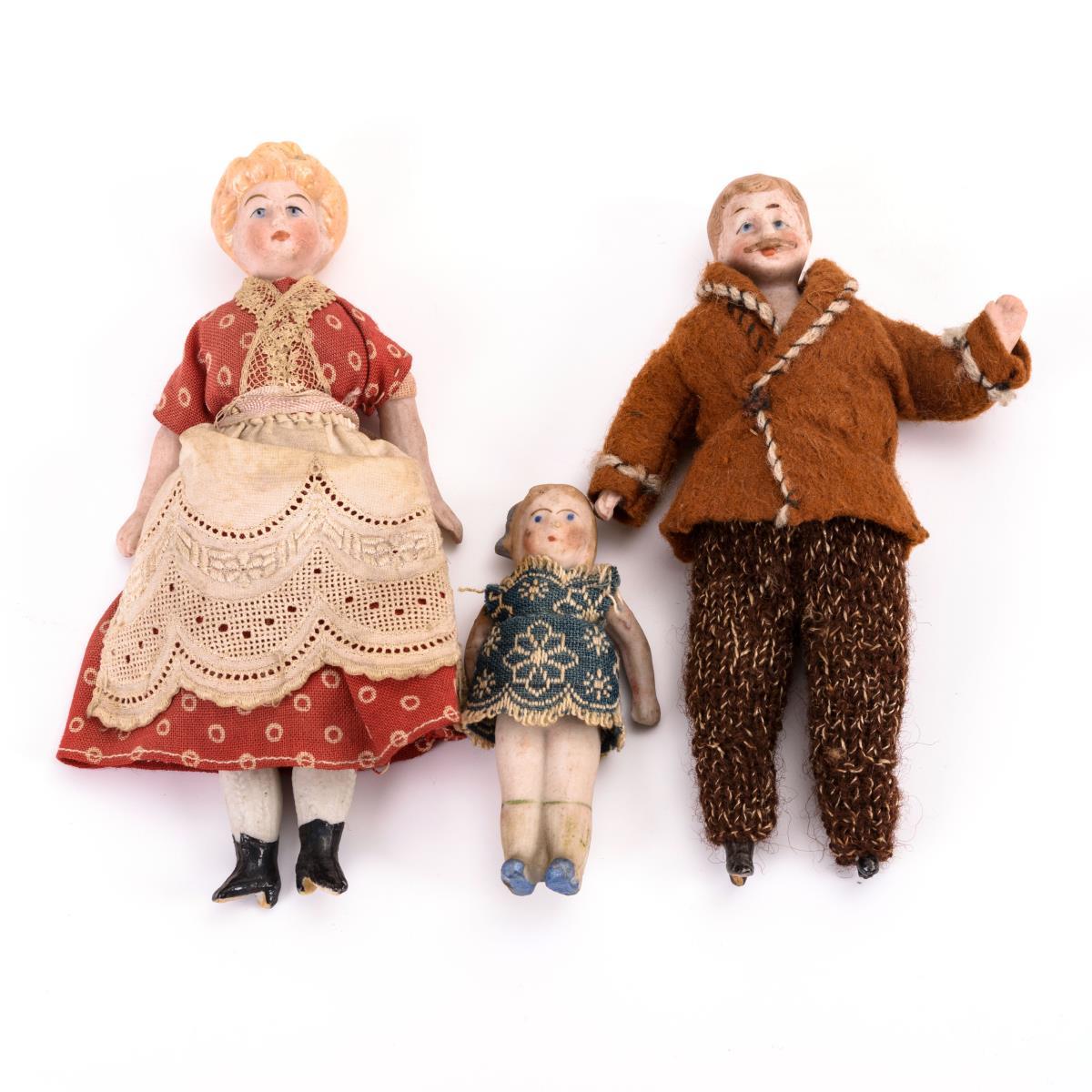 Alle mit festen Köpfen, gemalten Augen und modellierten Haaren. Eltern mit Brustkopf und Stoffkörper, Kind Ganzbiskuit. Altersspuren, 1 Fuß wohl ergänzt.