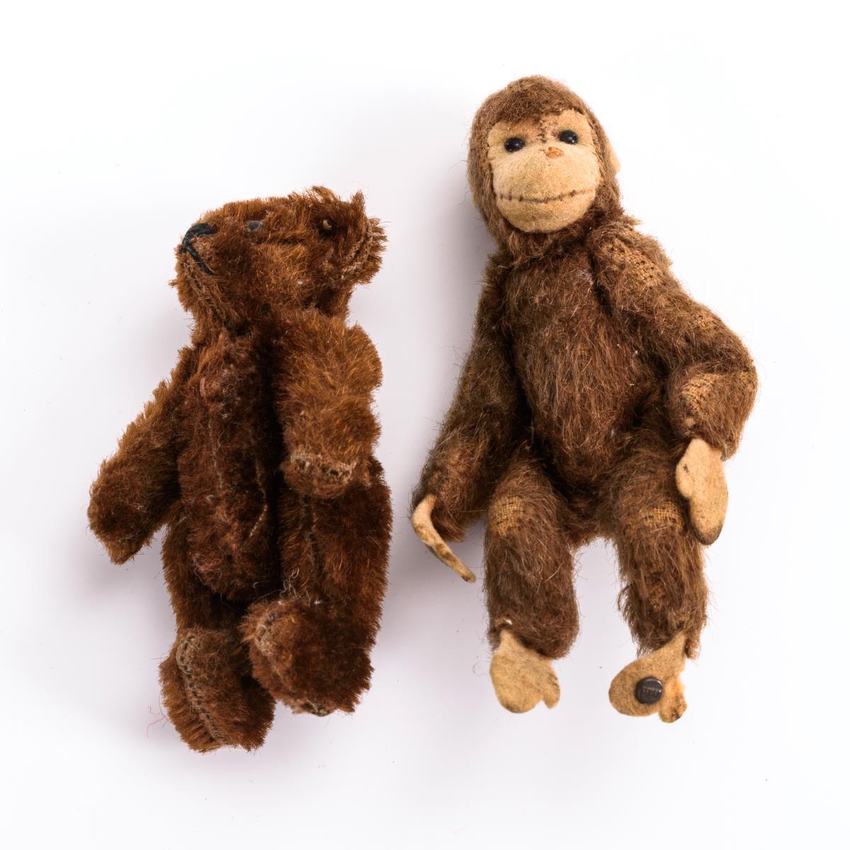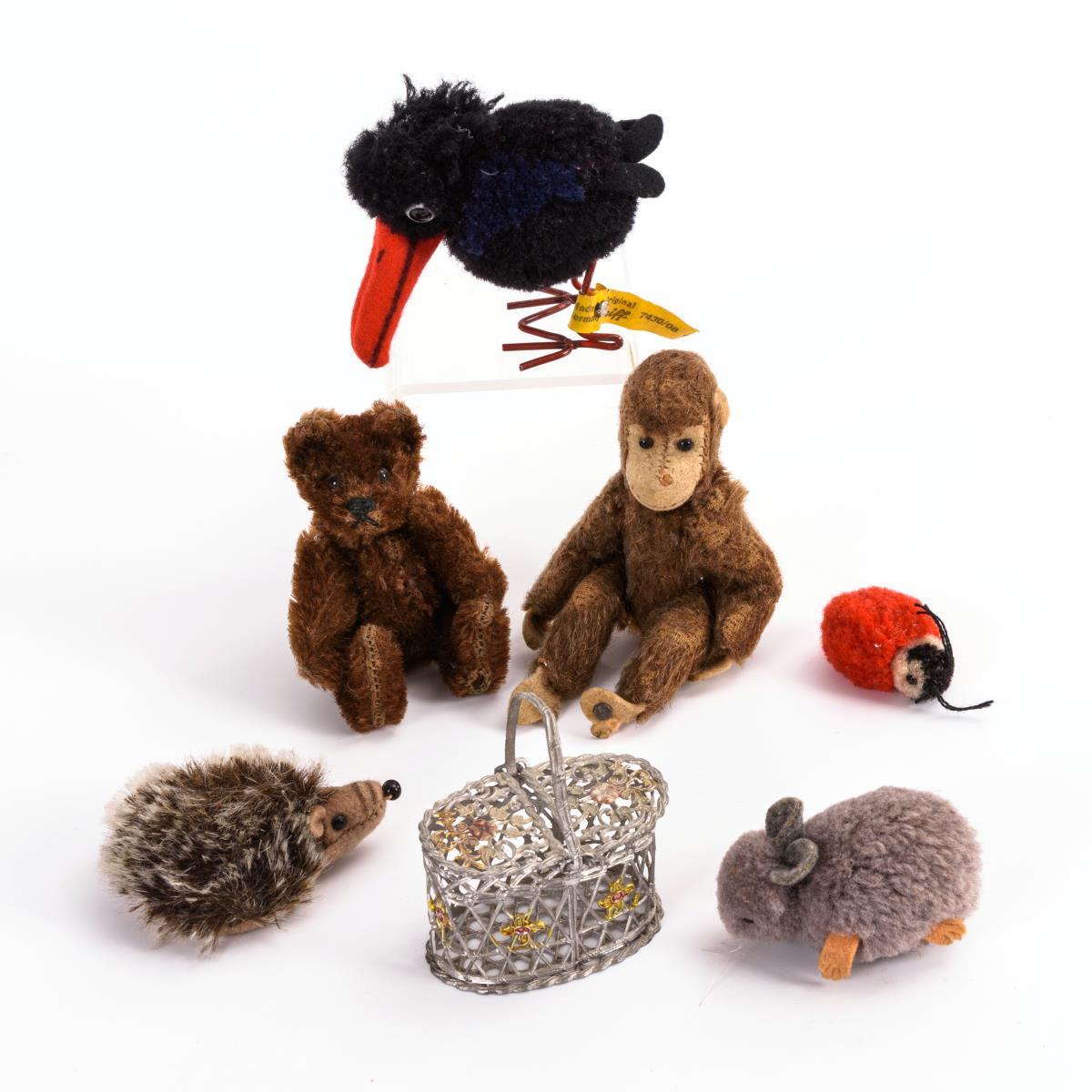 Affe, Teddy, Igel, Rabe und 2 Wollminiaturen. Dazu durchbrochenes Henkelkörbchen. Leichte Altersspuren, Affe und Teddy mit Kahlstellen.