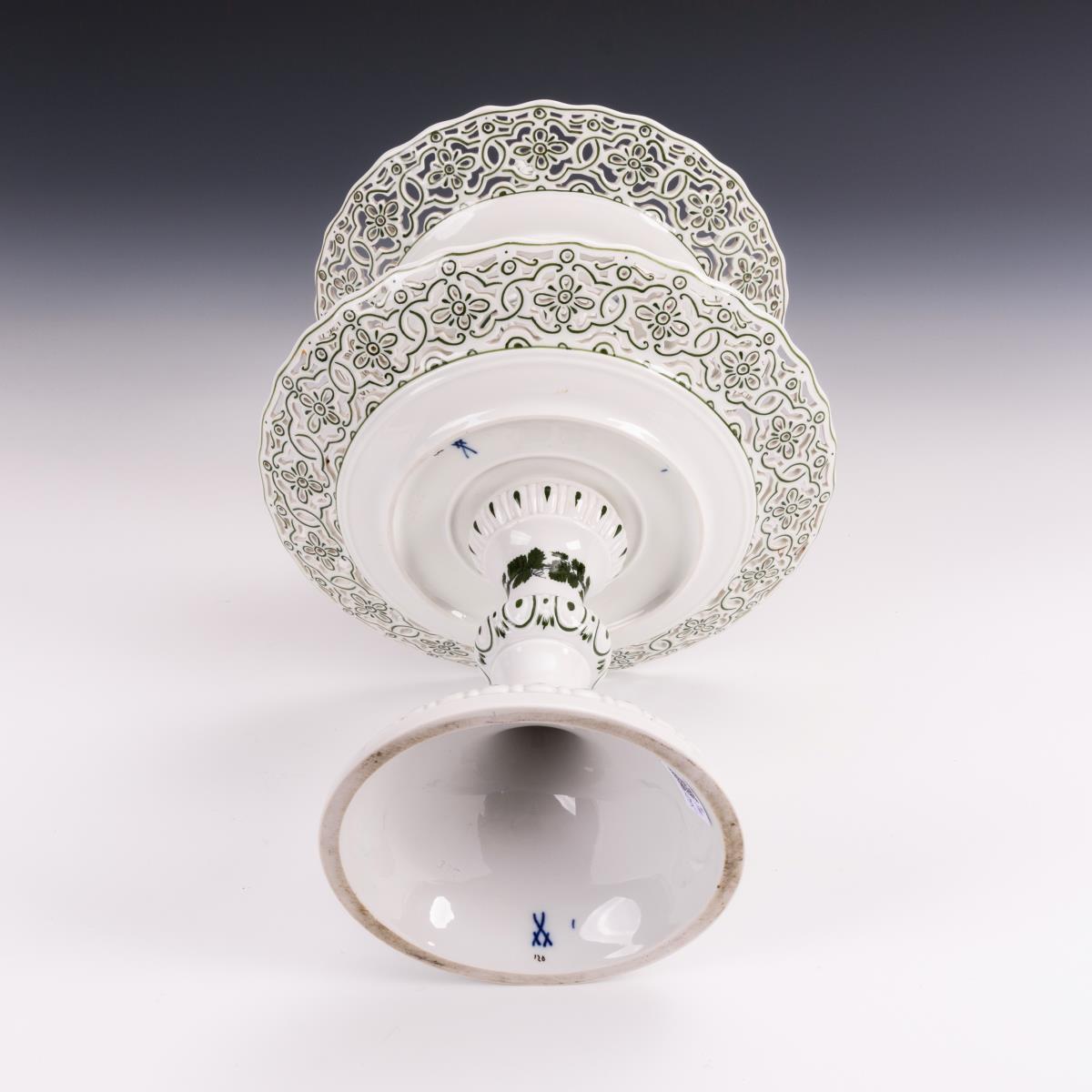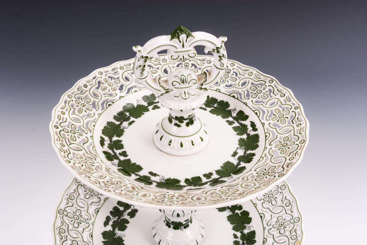 Tafelaufsatz mit zwei blütendurchbrochenen Tellern und Rundfuß.