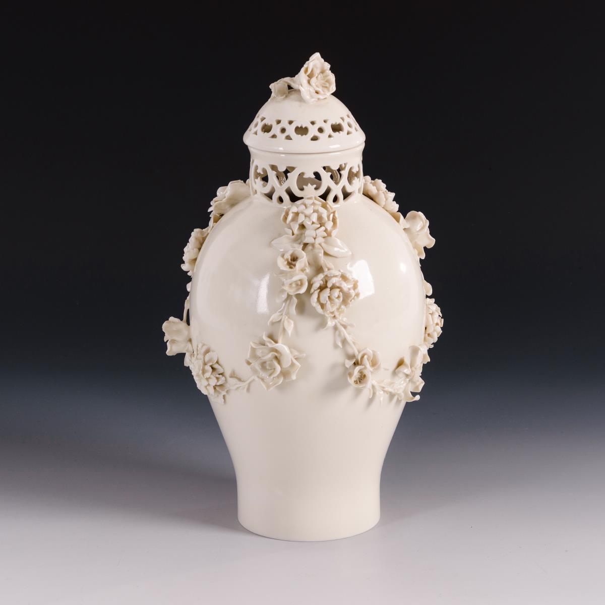 Balustervase mit ornamental durchbrochenem Hals und Deckel sowie aufgelegten Blütenfestons. Minimale Bestoßungen am Belag.