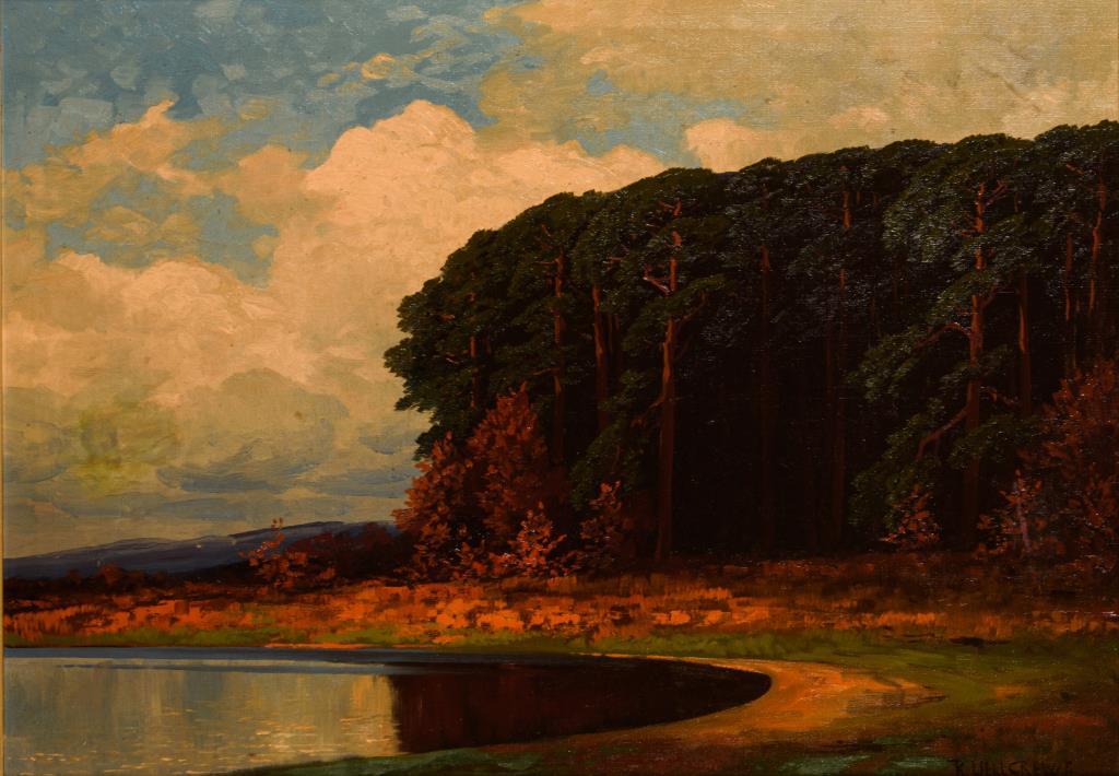 Herbstliches Seeufer bei bewölktem Himmel und Sonnenschein. Eine kleine restaurierte Stelle.