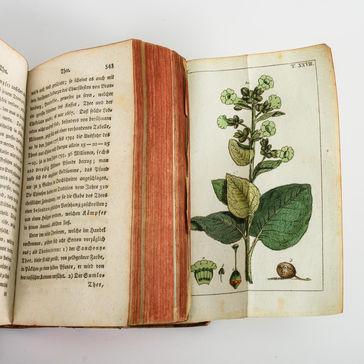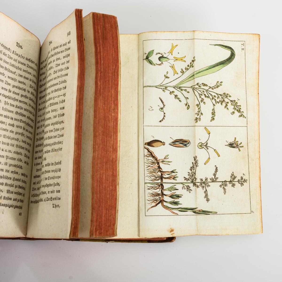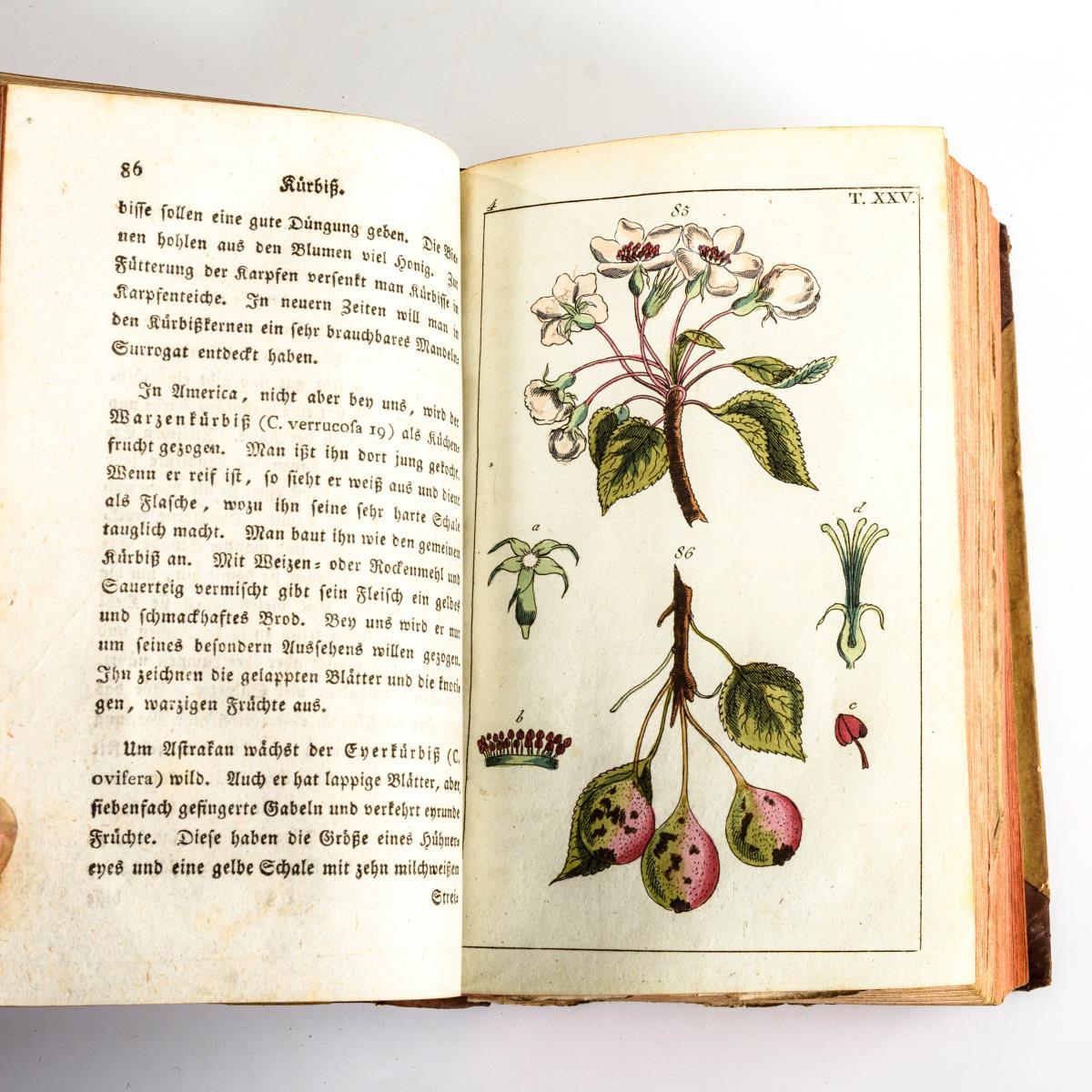 2. Band: Allgemeine Einleitung, 2. Theil, 558 Seiten und 61 kolorierte Tafeln / 3. Band: Mehlgebende Pflanzen, Küchengewächse und Obst, 732 Seiten und 87 kolorierte Tafeln / 4. Band: Küchengewächse und Obst, 764 Seiten und 47 kolorierte Tafeln/ 5. Band: Obst, Gewürze, Oele und Zucker. 730 Seiten und 63 kolorierte Tafeln (2 fehlen) / 6. Band: Gräser und Futterkräuter, 740, (36) Seiten und 61 kolorierte Tafeln (eine fehlt). Bücher im Halbledereinband . Mit stärkeren Gebrauchsspuren, wenige Seiten eingerissen.