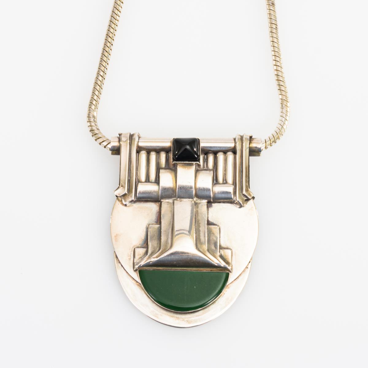 Geometrisch plastisch gestalteter Anhänger mit schwarzer und grüner Einlage.