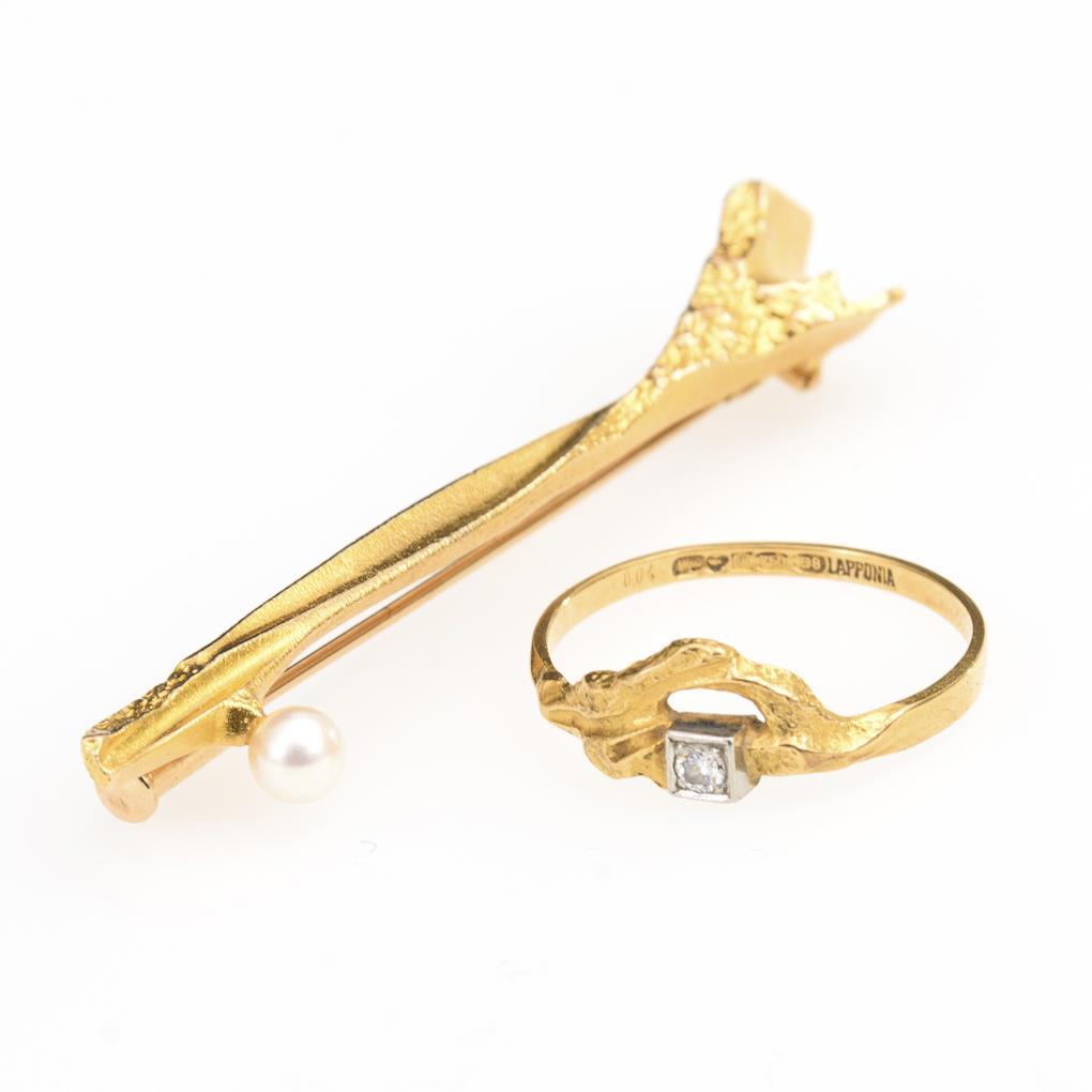 Gelbgold 750/585 gestempelt. Punzen: LAPPONIA D8, G8 von 1981/1984, Helsinki. Ringgröße 56, Nadel L 5,5 cm. 6,2 g.