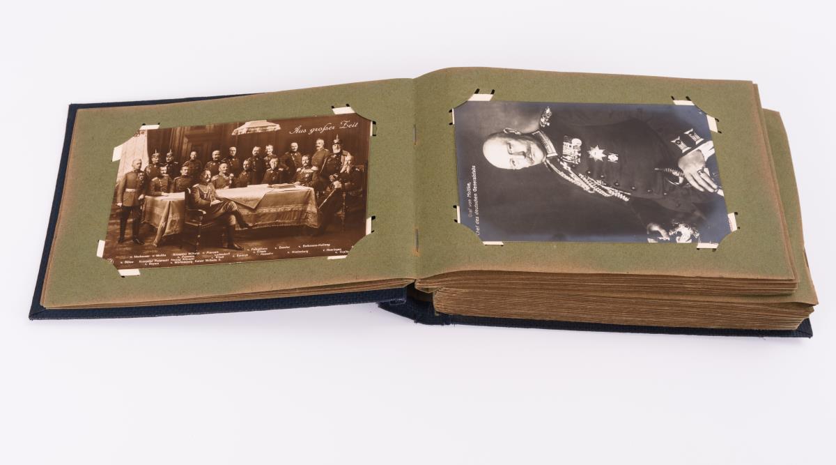 Dunkelblaues Album mit dem Bildnis von Hindenburg. Innen Postkarten von Kaiser Wilhelm II, einigen Generälen (Moltke, Bülow usw.), Kriegs-Karikaturen sowie einige Soldatenfotos vom 1. Weltkrieg. Außerdem Ansichtskarten von Rudolstadt und Thüringen, teils auch Italien und London sowie Familienfotos. Album wenige Alters-/Gebrauchsspuren.