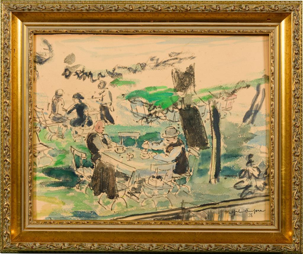 Impressionistisch gemalte Personen an den Tischen im Biergarten. Leichte Altersspuren.